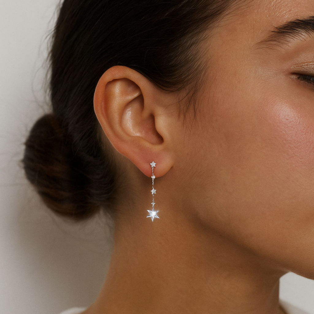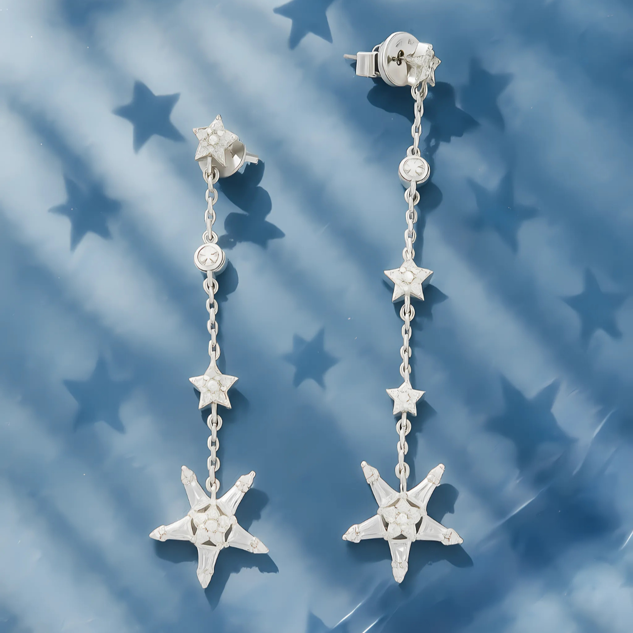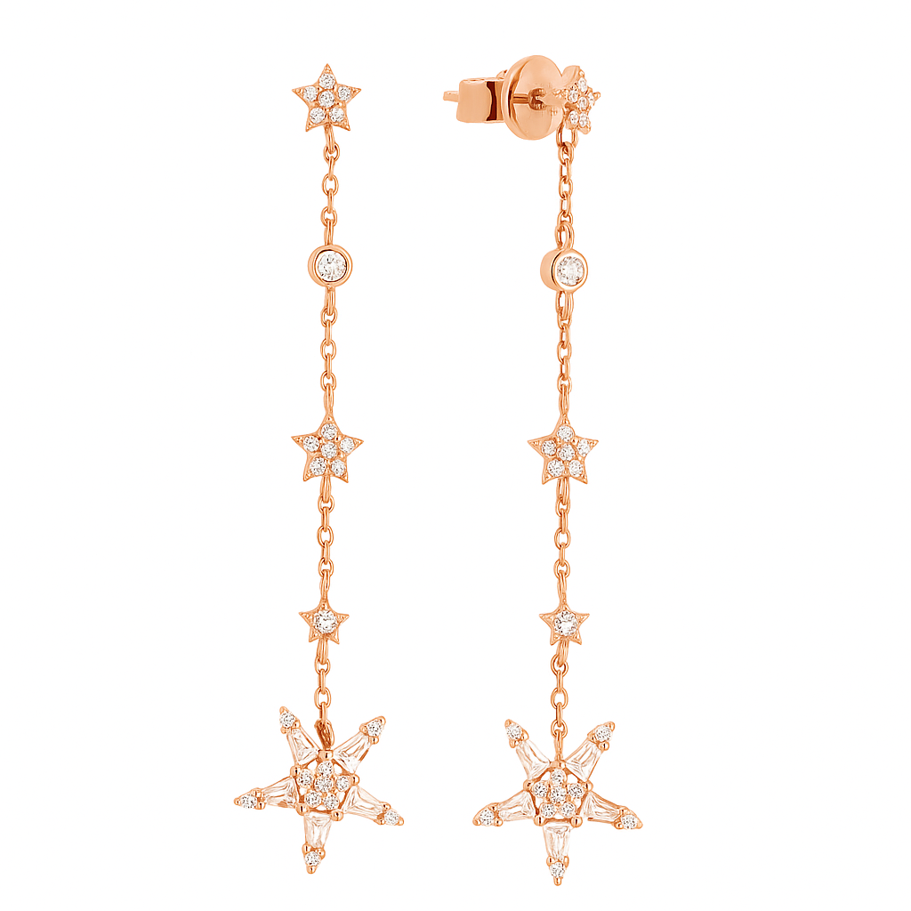 • Inspired by constellations, these earrings cascade like falling stars, with a series of radiant VS1 diamonds leading to a brilliant star-shaped finale. Each drop moves gracefully, catching the light with every turn, embodying both glamour and celestial wonder. Available in 18k white, yellow, or rose gold, they are a poetic celebration of light, hope, and infinite beauty.