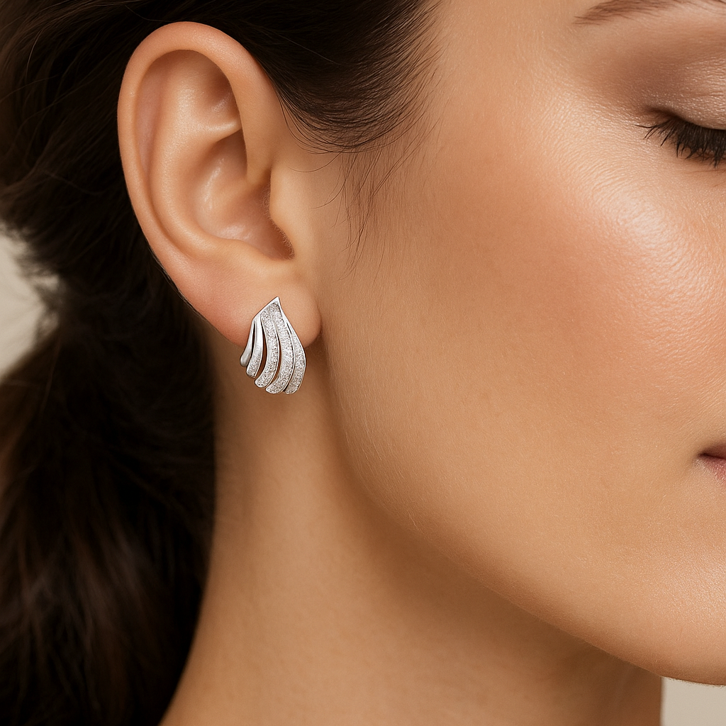 18k white, rose, or yellow gold with VS1 diamonds Sweeping arcs of pavé diamonds unfurl like wings in flight, sculpted in luminous gold. Bold yet refined, these earrings embody strength, aspiration, and the grace of freedom. Each curve mirrors the elegance of motion, designed for the woman who commands her path with quiet confidence and radiant presence.