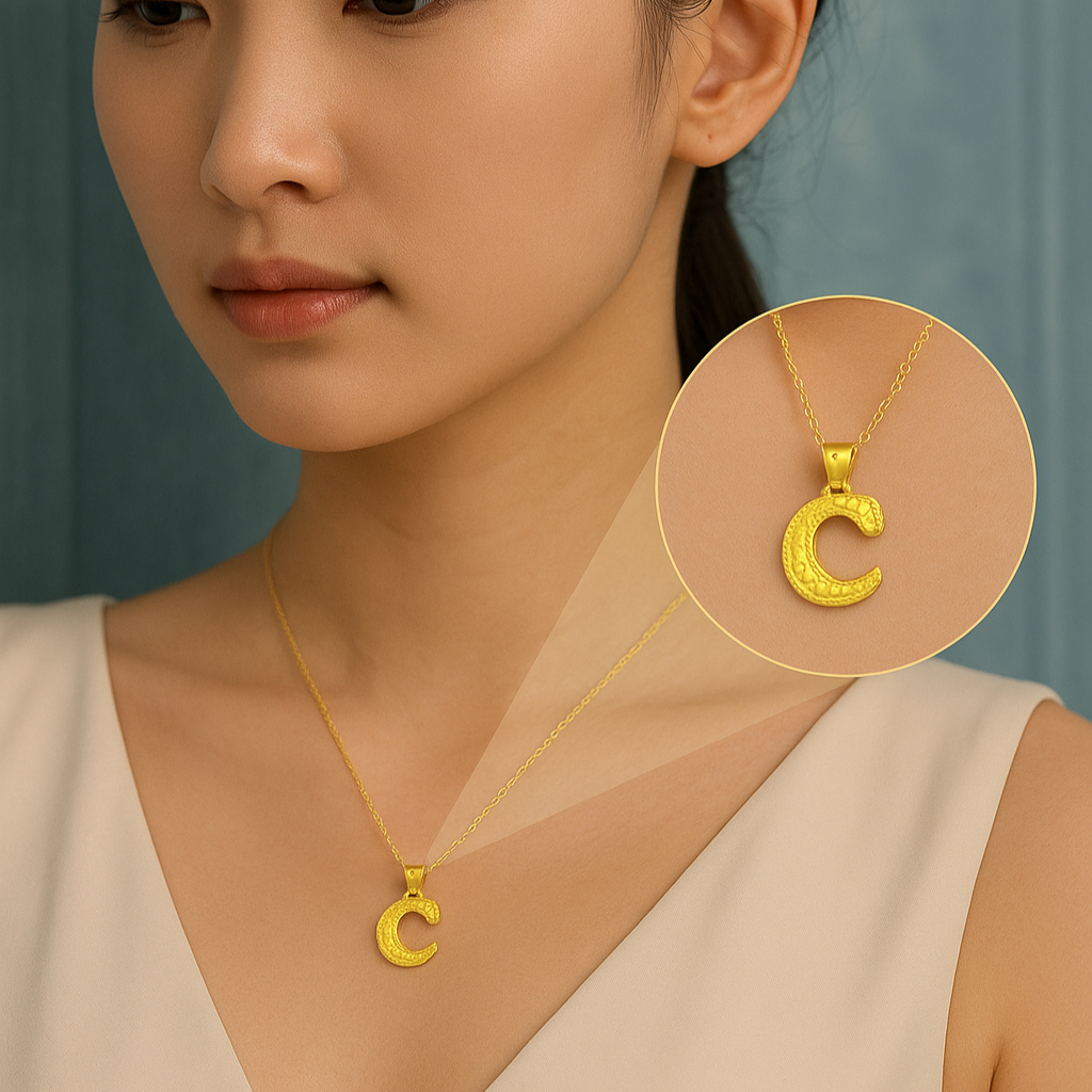 • The Chic Gold Initial “C” Pendant radiates refined beauty with its intricate texture and flawless polish. Crafted for those who embrace modern sophistication, it reflects light with every move, capturing attention effortlessly. Perfect as a personal signature or a heartfelt gift, this pendant embodies timeless style and golden confidence.