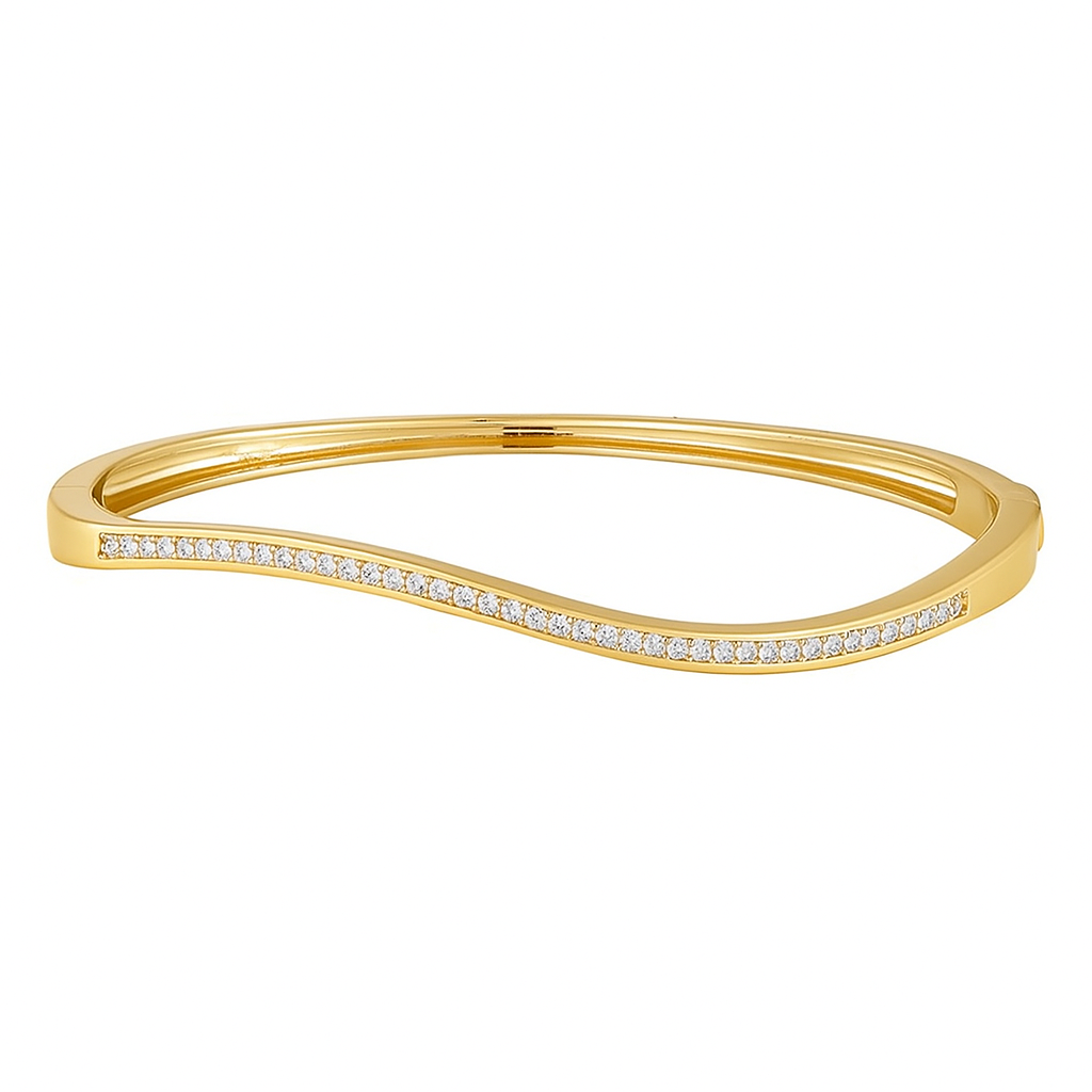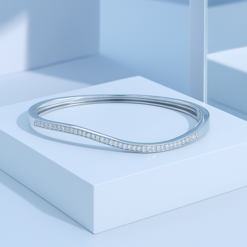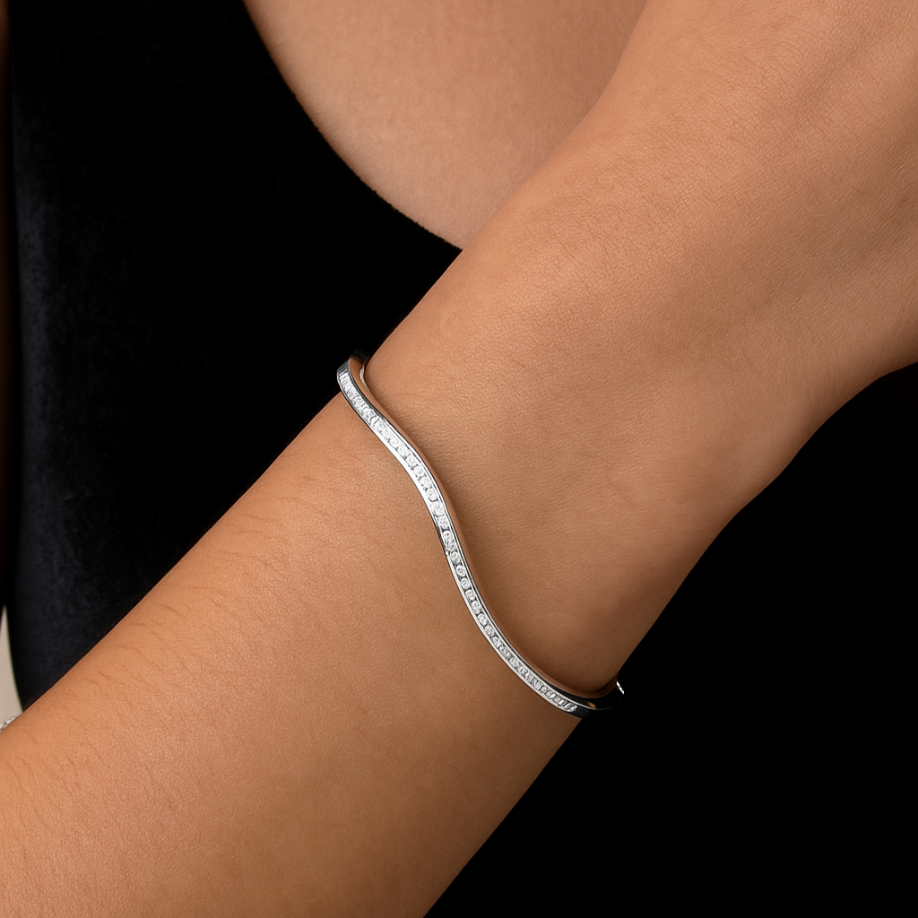 Minimalism at its finest—this sleek bangle flows like a wave in motion, its silhouette lined with a delicate river of VS1 diamonds. Elegant and architectural, it embodies effortless luxury for the modern woman who commands presence in simplicity.