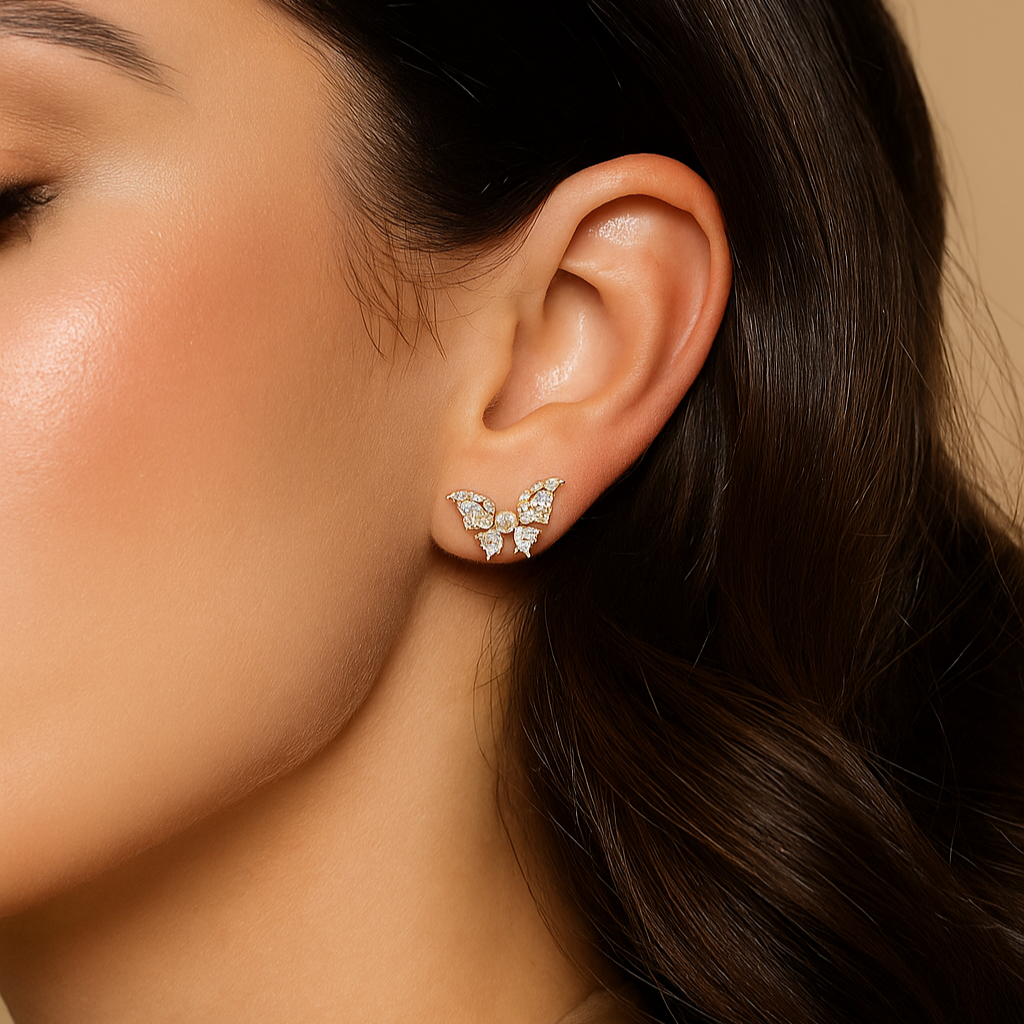These 18K gold butterfly studs take flight with marquise-shaped VS1 diamond wings and a pearl at their heart. A poetic blend of sparkle and softness, embodying grace in motion.