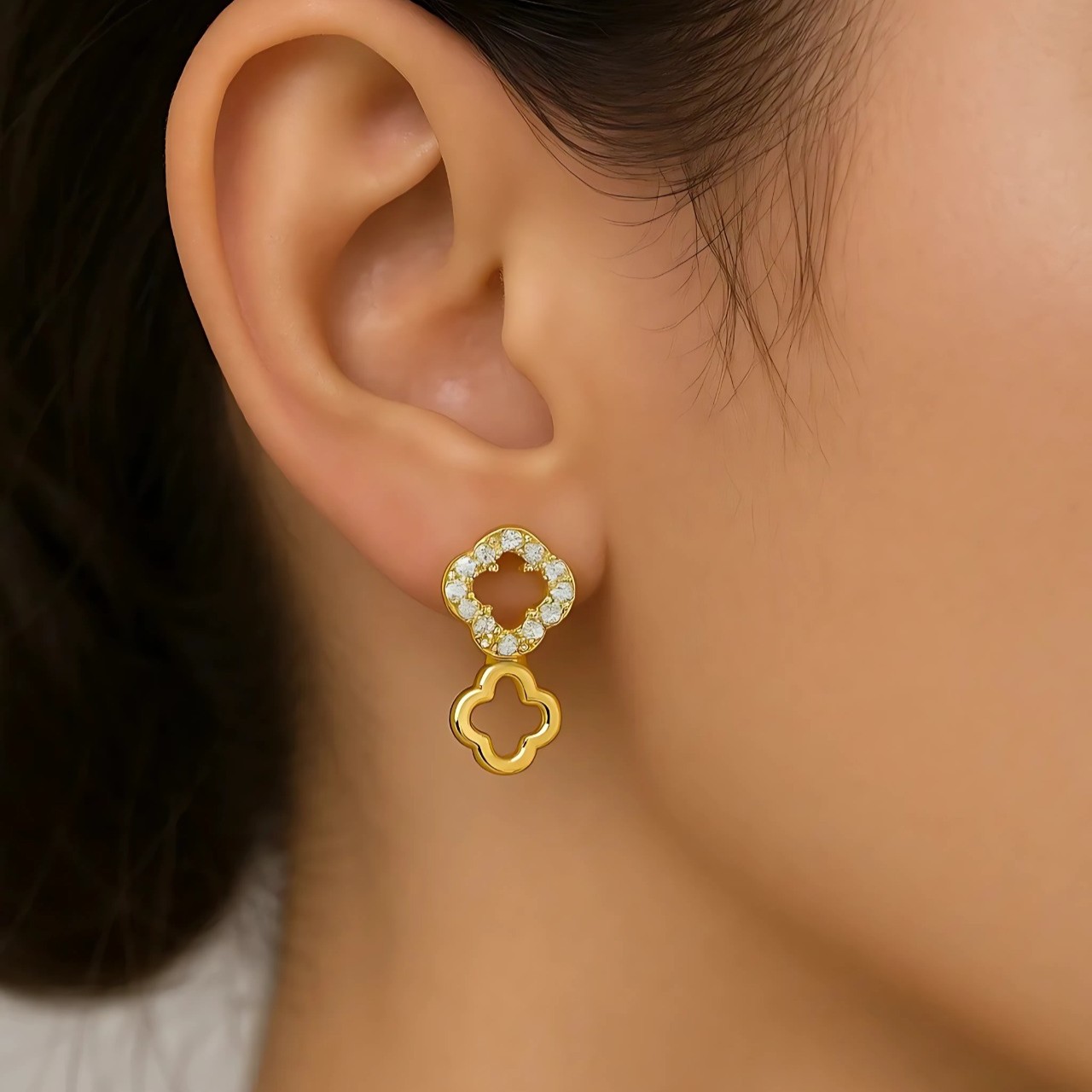 These 18K gold drop earrings pair two clover motifs — one outlined in VS1 diamonds and the other in sleek polished gold — creating a harmonious play of light and texture. Gentle movement adds a captivating sparkle, making them a versatile choice for both day and evening sophistication.