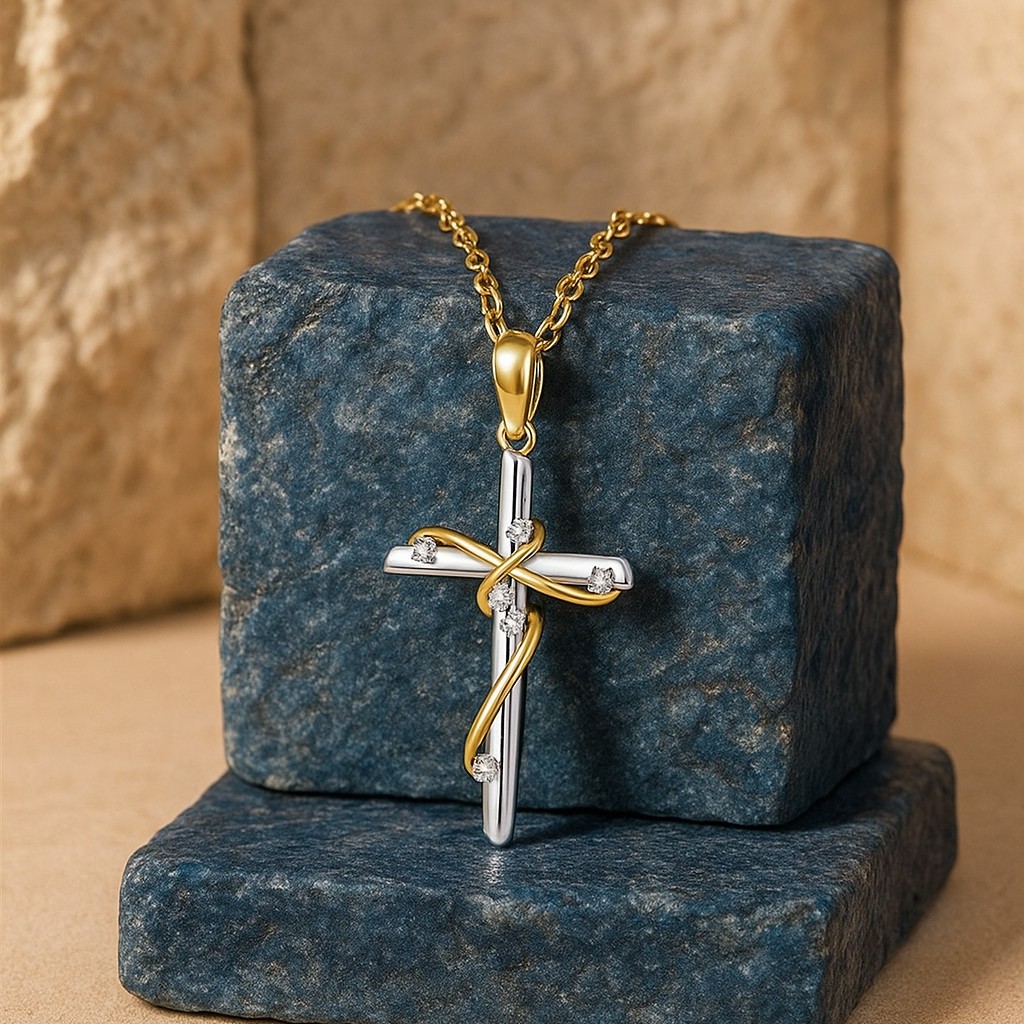 A cross of luminous gold and white, intertwined with a ribbon of contrasting metal, symbolizes unity and faith. Embedded with fine VS1 diamonds, it transcends tradition to become a piece of spiritual luxury — understated yet eternal.