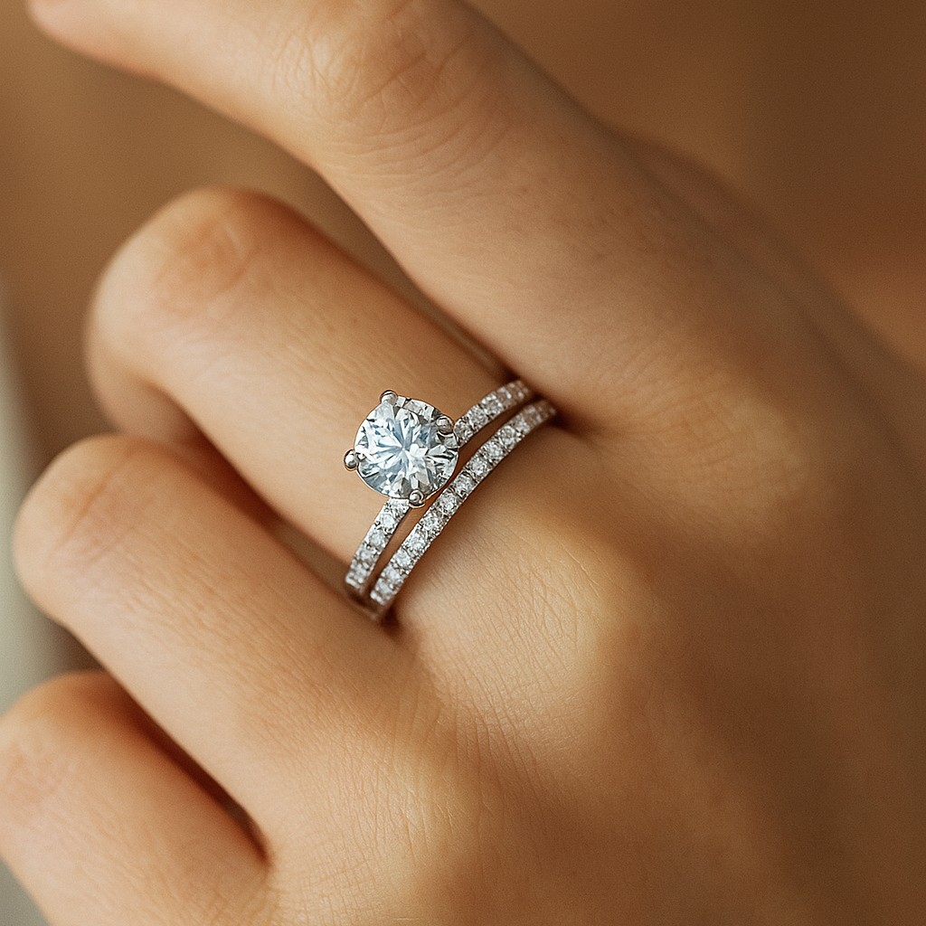 A classic round brilliant diamond crowns this elegant bridal set, complemented by two diamond-paved bands. The central solitaire shines with unmatched brilliance, elevated by the symmetry of the dual rows of diamonds. Worn together, the rings create a statement of everlasting elegance, while each band can also stand beautifully alone. Perfect for celebrating love and milestones.