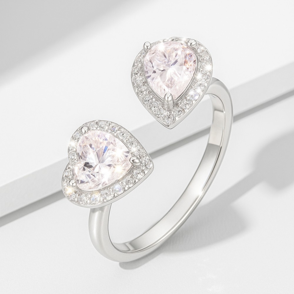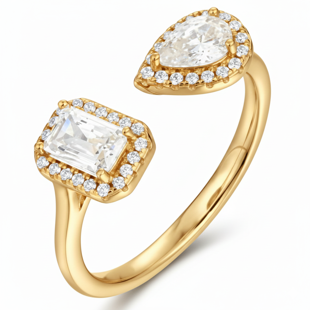 • This contemporary design is bold and unique, showcasing two different shapes in harmony — a rectangular emerald-cut diamond and a pear-cut diamond. Each is surrounded by a delicate halo, balancing symmetry with asymmetry. The bypass-style band offers modern flair, while the double diamonds symbolize partnership and duality. A striking piece for those who love distinctive designs.