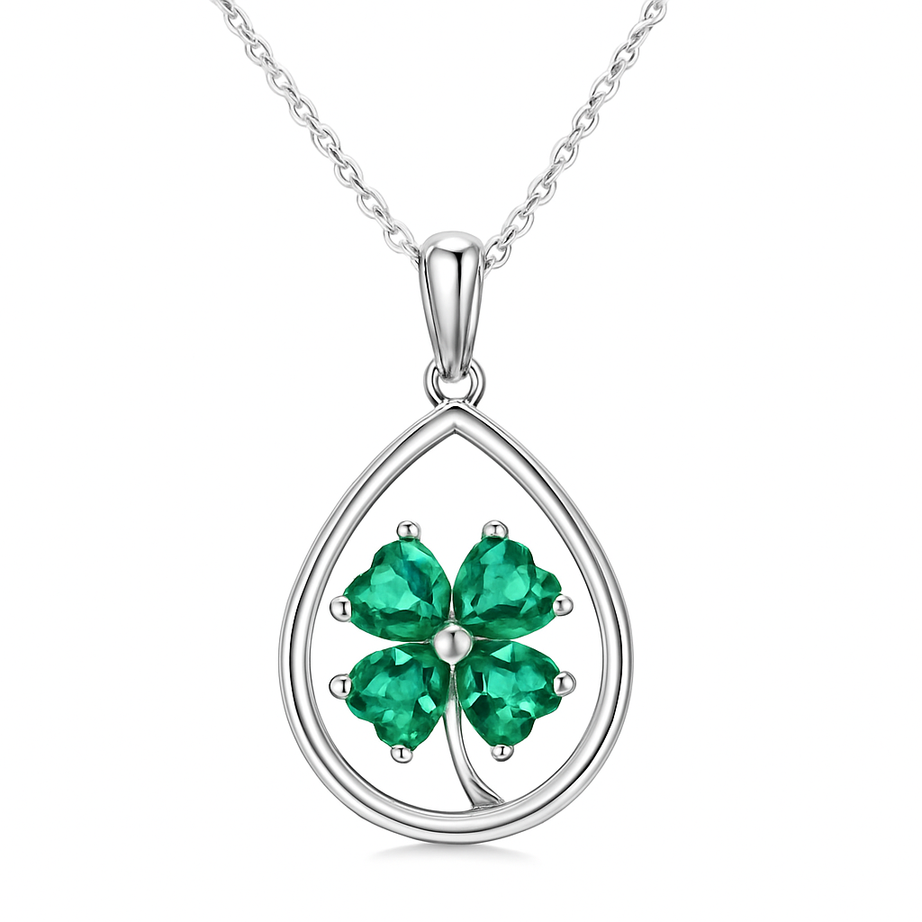 • A teardrop frame houses a delicately sculpted four-leaf clover, each leaf crafted from heart-cut emeralds. A timeless emblem of luck and prosperity, this pendant transforms nature’s most cherished symbol into a rare treasure of fine artistry.