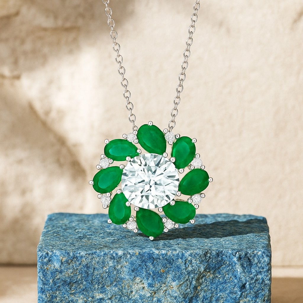Emerald teardrops and VS1 diamonds circle around a magnificent center stone, forming a vibrant wreath of color and brilliance. With its dynamic spiral pattern, the pendant symbolizes harmony, unity, and eternal renewal. A perfect blend of vitality and classic sophistication.