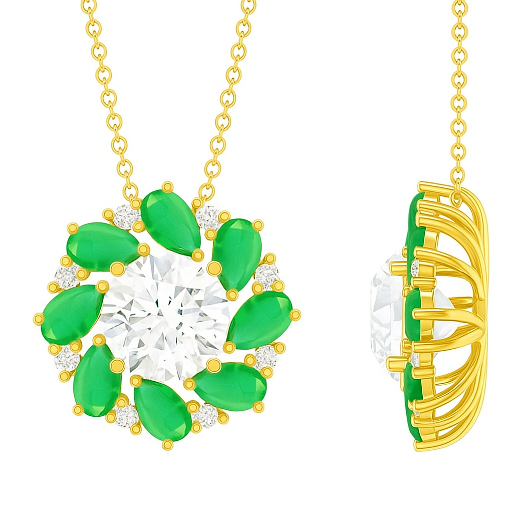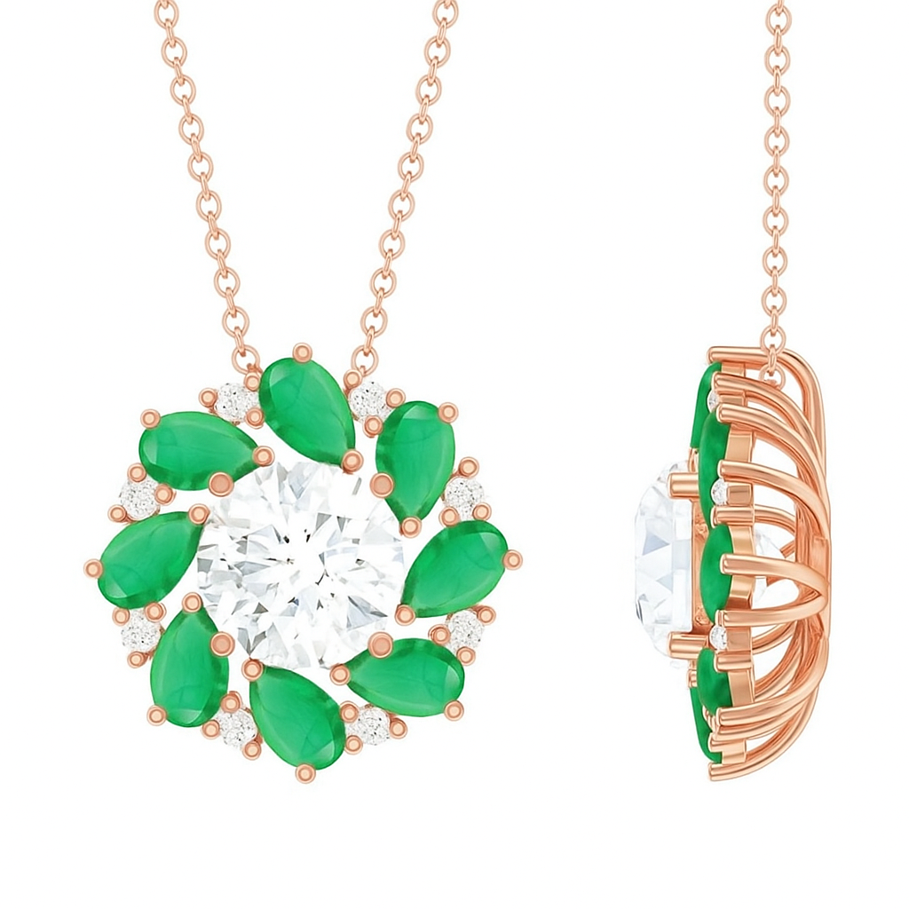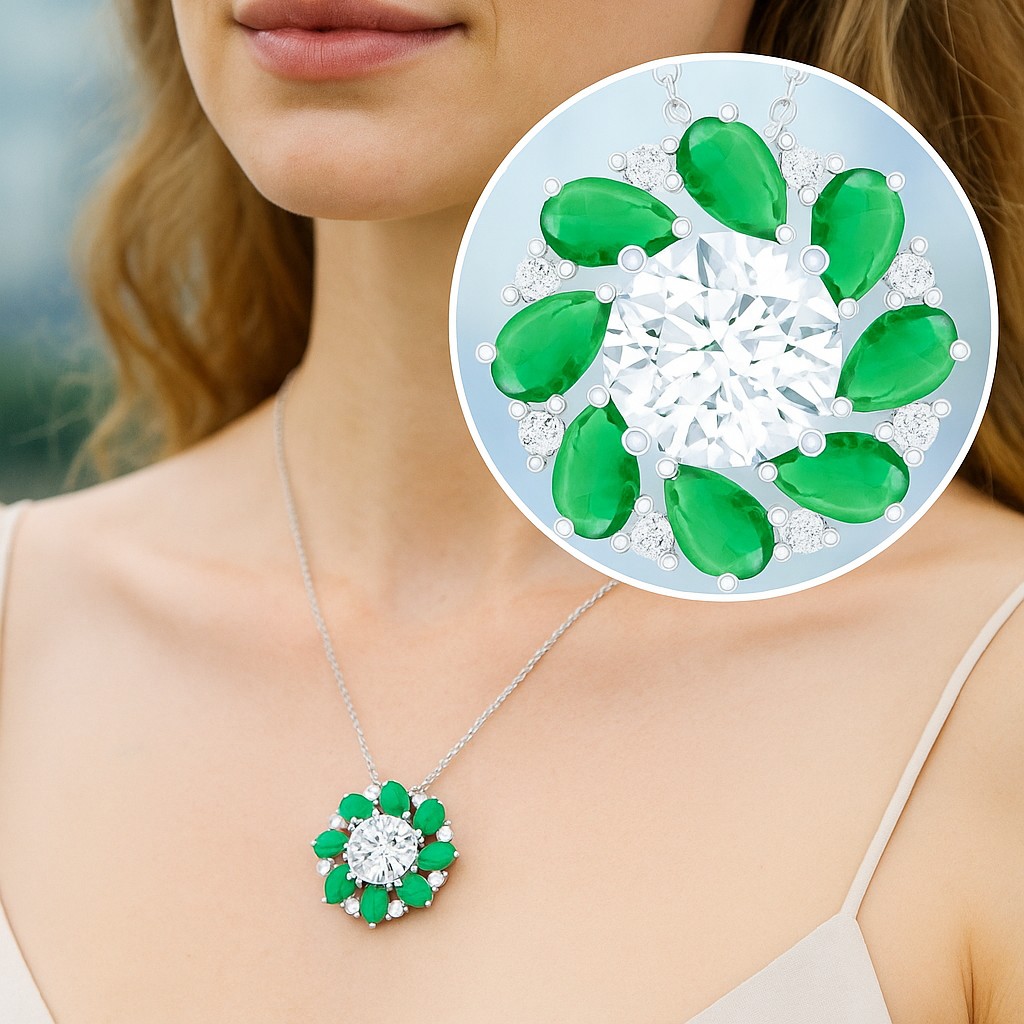 • Emerald teardrops and VS1 diamonds circle around a magnificent center stone, forming a vibrant wreath of color and brilliance. With its dynamic spiral pattern, the pendant symbolizes harmony, unity, and eternal renewal. A perfect blend of vitality and classic sophistication.