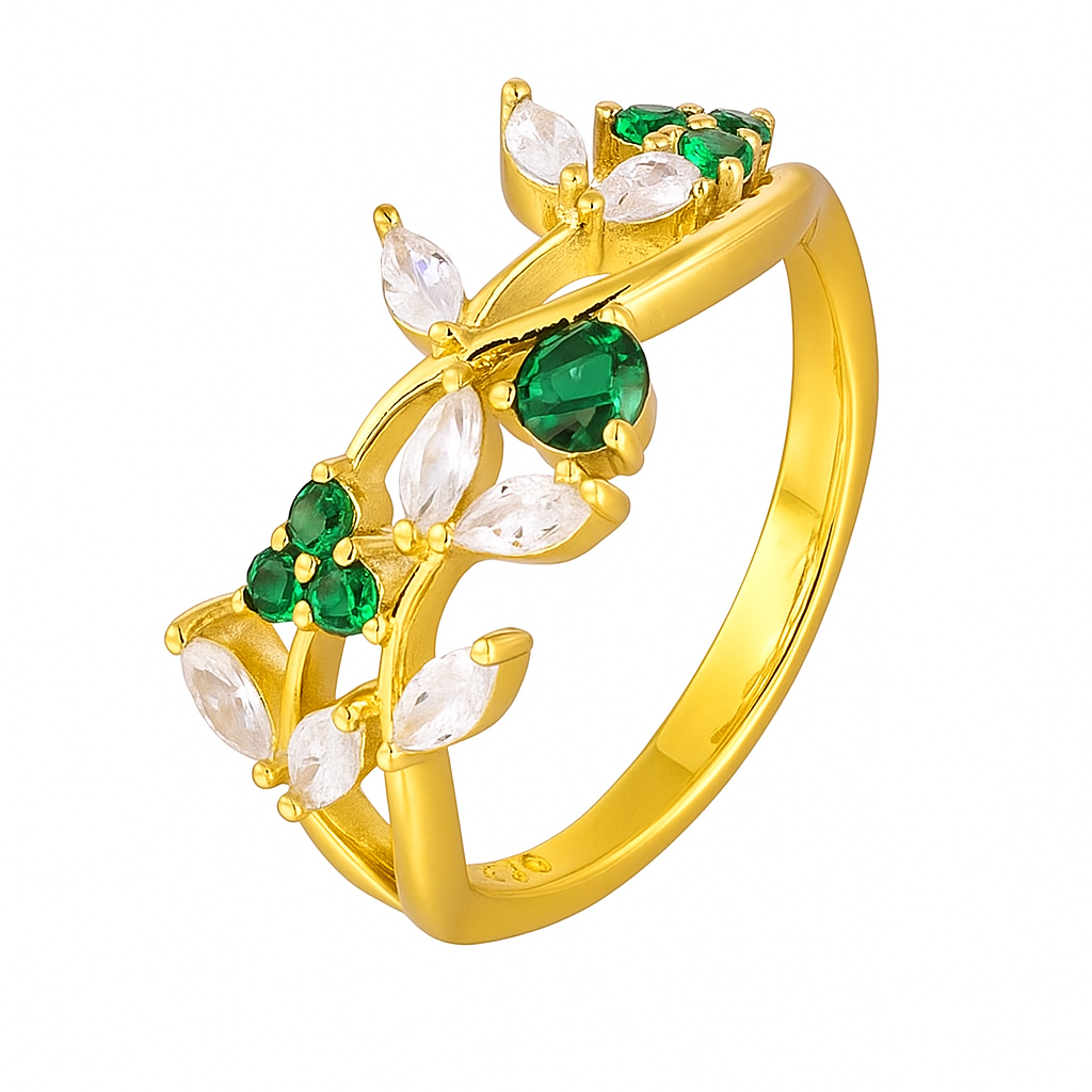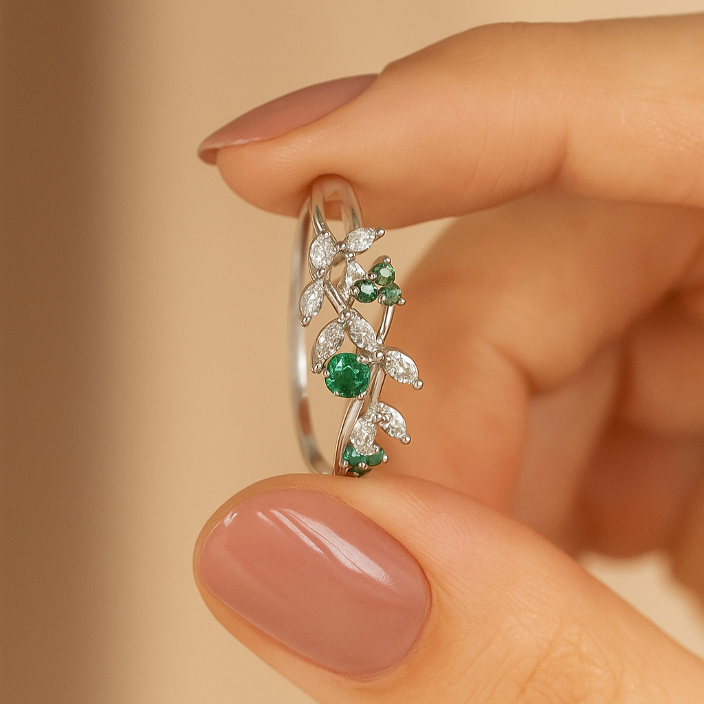 Inspired by nature’s artistry, this ring blossoms with emeralds and diamonds in a graceful vine design. Symbolizing growth, renewal, and flourishing love, it is both a jewel and a living story of beauty.
