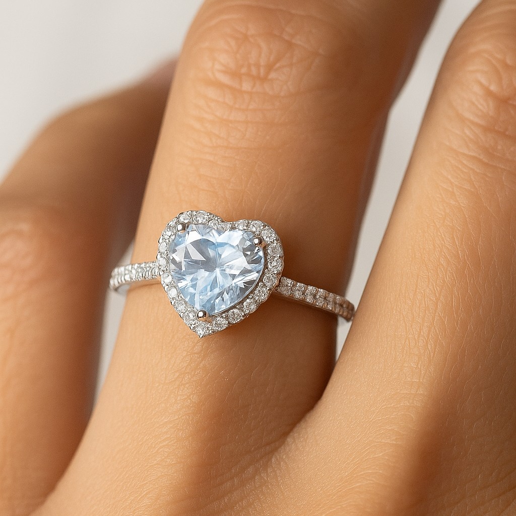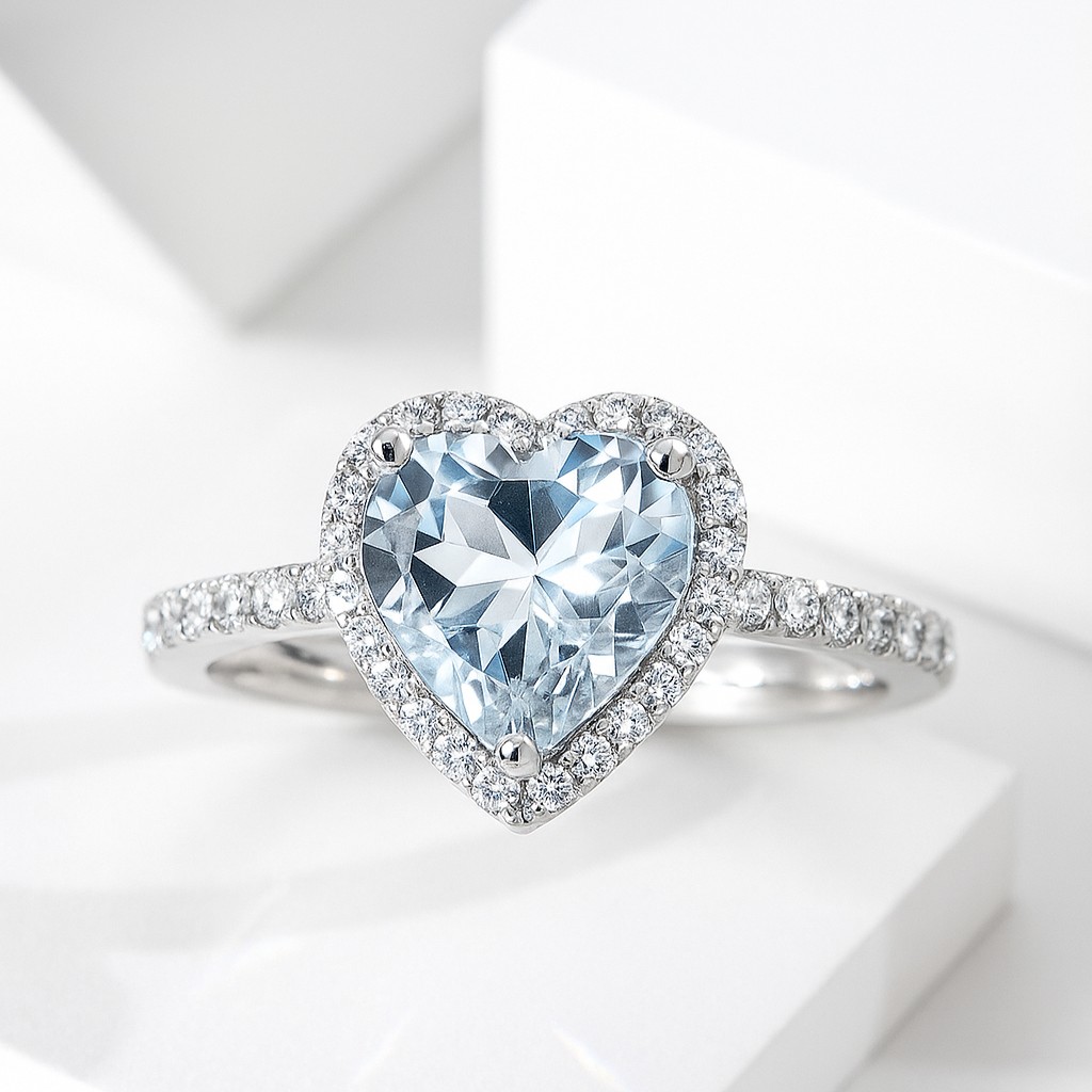 • A luminous heart-shaped diamond takes center stage, embraced by a halo of sparkling pavé stones and set upon a band lined with delicate brilliance. This ring is a symbol of everlasting love—bold, romantic, and forever radiant.