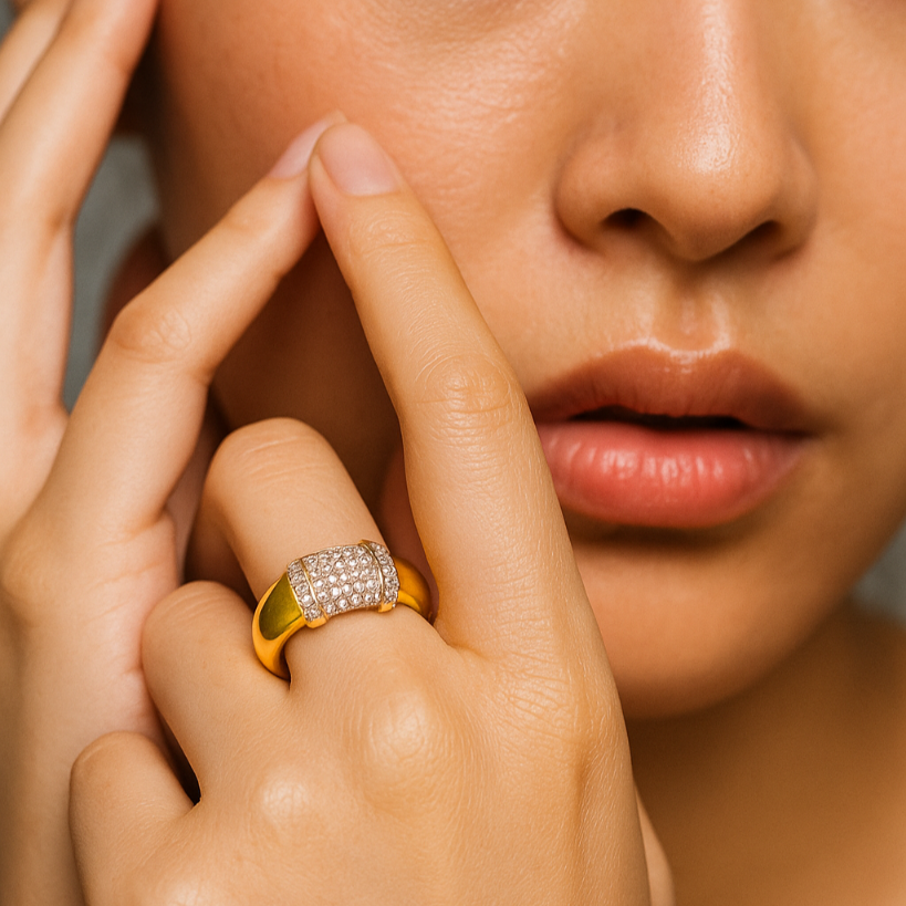 • Feel the difference of this exquisite gold ring, where a wide, smooth golden band beautifully frames a centralized cylinder of multi-row, shimmering white stones. The solid design and brilliant contrast create a luxurious, unforgettable focal point with deep emotional significance. It's the perfect high-end accessory to celebrate a cherished commitment with a contemporary, eye-catching design.