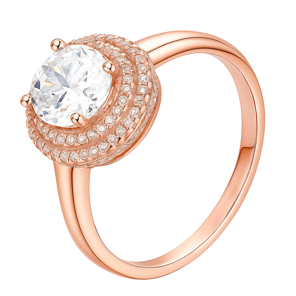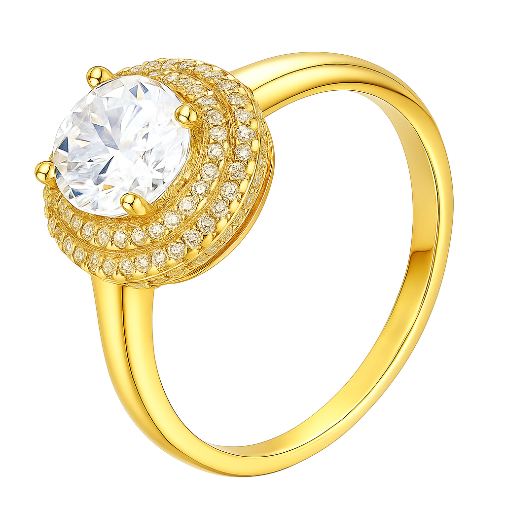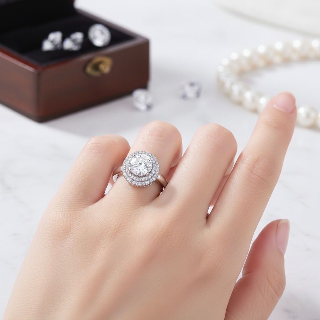 • A dazzling center diamond, customizable to your desire, rests upon a luminous double-halo of fine pavé brilliance. The design elevates the stone in a graceful setting, allowing light to dance endlessly across its facets. A perfect emblem of eternal love and sophistication.                                                                                The Eternal Radiance Collection