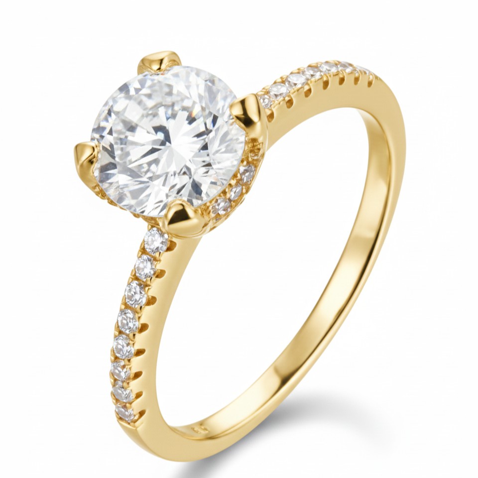A classic round solitaire elevated with subtle pavé shoulders — understated yet profound. This design speaks to those who treasure simplicity refined to perfection. The brilliance of the center stone draws every gaze, promising a love that will shine through the years with quiet strength.