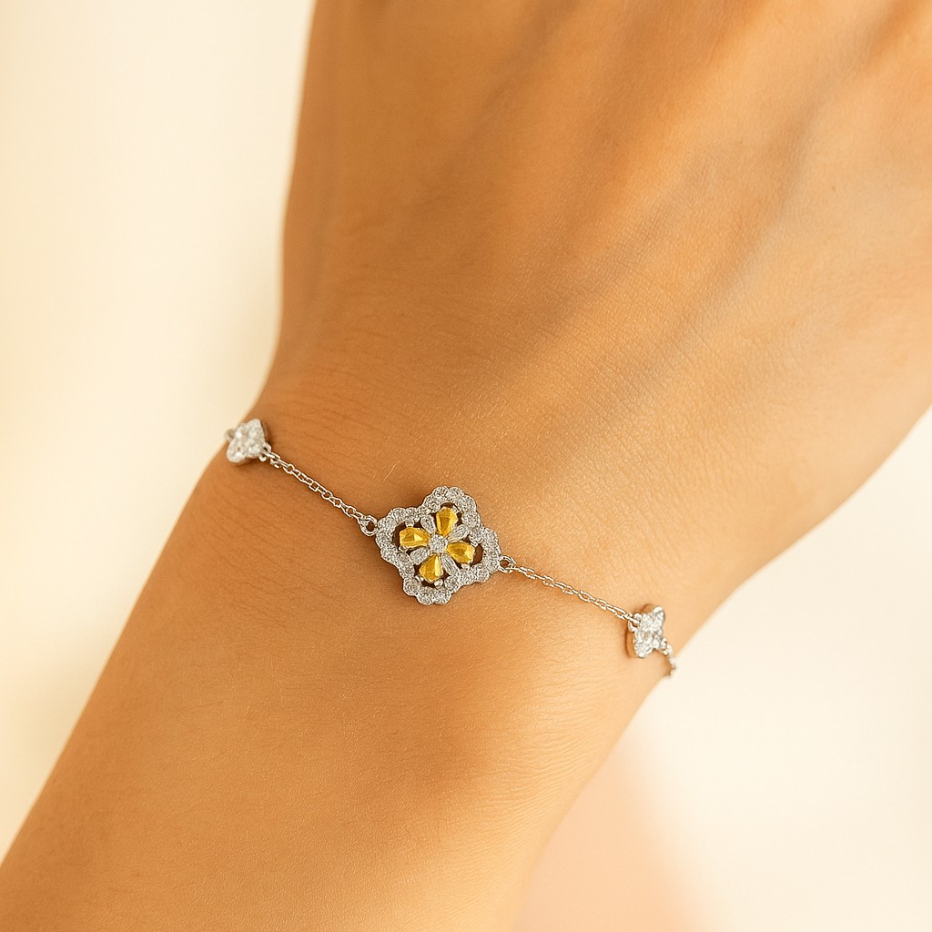 Delicate floral artistry comes alive with golden-hued accents encircled by shimmering diamonds. This bracelet whispers of sunlit gardens and eternal renewal, marrying timeless charm with refined luxury.