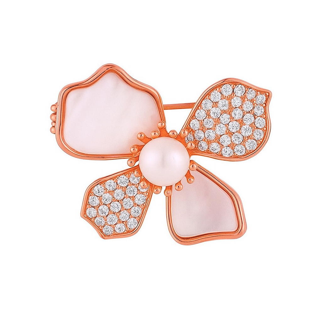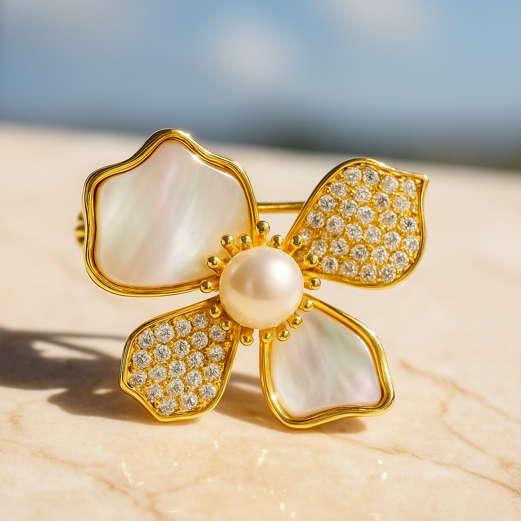 A modern ode to nature’s poetry, this 18k gold brooch blooms with petals of luminous mother-of-pearl and pavé-set VS1 diamonds, united by a lustrous freshwater pearl at the center. The design speaks of delicate strength and refined beauty, a perfect harmony between softness and brilliance. Romantic and radiant, it is a jewel that whispers sophistication while carrying the warmth of an everlasting bloom.