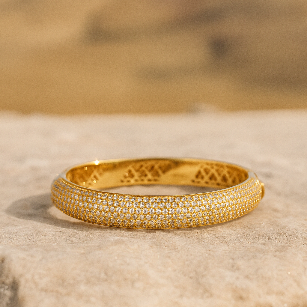 • An unbroken band of radiance, this 18K gold bangle — available in white, rose, or yellow — is meticulously set with VS1 diamonds, creating a seamless shimmer around the wrist. It is a statement of elegance and strength, perfect for marking life’s most treasured milestones.
