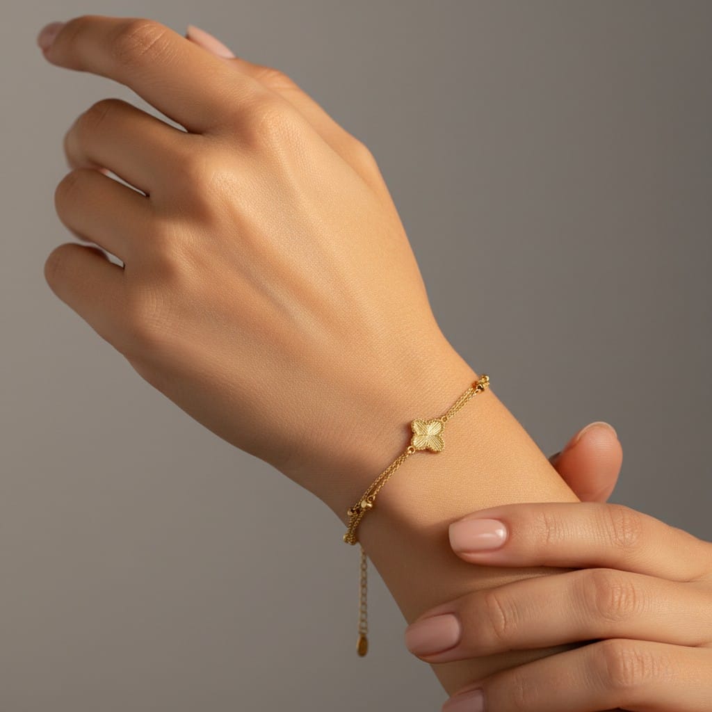 • This refined 916 gold bracelet captures the beauty of simplicity with its softly detailed 11 mm butterfly centerpiece, symbolizing freedom and transformation. The double-chain design is adorned with 3 mm polished gold beads that shimmer with every subtle movement. Crafted to exude timeless femininity, it wraps your wrist in warmth and light — perfect for daily wear or as a meaningful gift. A graceful reminder that even the smallest details can make the biggest impression.