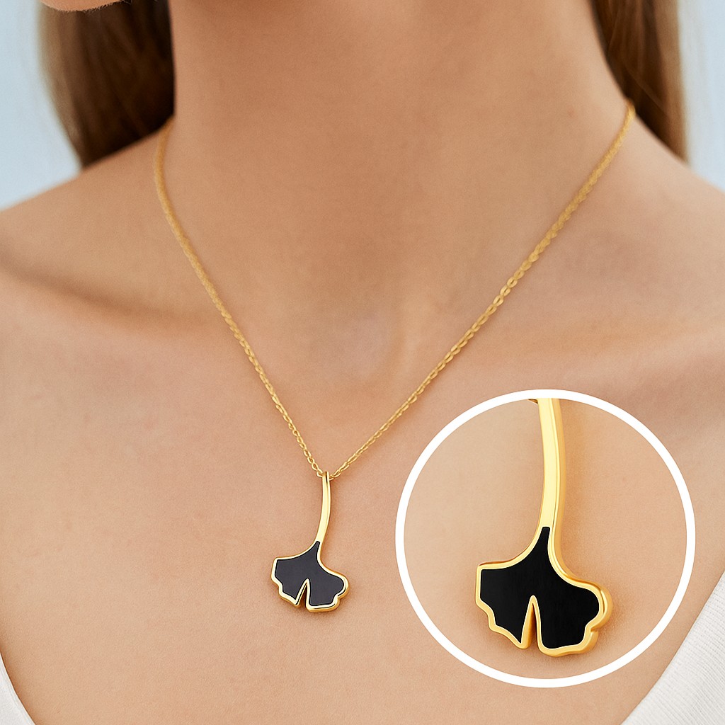 • A single ginkgo leaf rests upon a slender gold stem, transformed into a pendant of sculptural beauty. Measuring 23mm, the pendant balances minimalism with natural artistry, creating a talisman of resilience that can be worn close to the heart. Its bold black enamel contrasts beautifully with polished gold, symbolizing harmony between strength and grace.