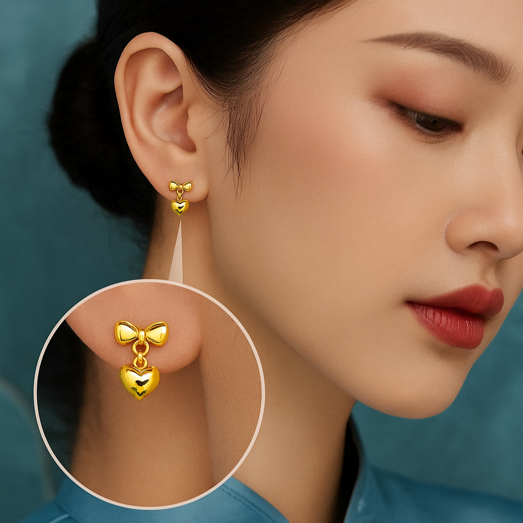 Sweet yet sophisticated, these golden bow-and-heart earrings embody playful elegance with a timeless romantic charm.