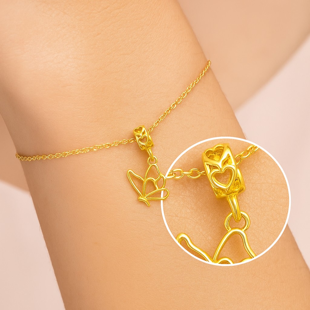 • Delicate yet striking, this 916 gold butterfly charm captures the beauty of transformation in its flowing, openwork design. The gentle curves and heart-inspired details exude a sense of romance and timeless femininity. Its radiant gold glow makes it the perfect piece to elevate any bracelet or necklace with effortless luxury. More than just jewelry—it’s a golden reminder to move gracefully through every chapter of life.