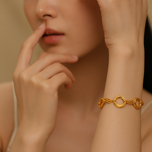 A bold yet elegant gold bracelet designed with interlocking loops that radiate modern sophistication and timeless allure.