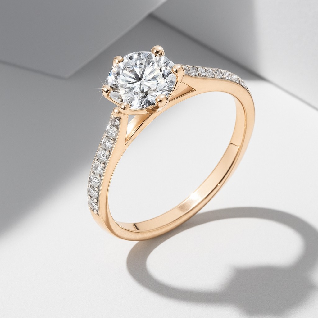• Available in 18K yellow,white or rose gold, this engagement ring radiates joy and devotion. The customisable central diamond is framed by a row of VS1 diamonds along the shoulders, symbolising the golden threads that weave two lives into one. Designed for the bride whose heart shines as brightly as her future.