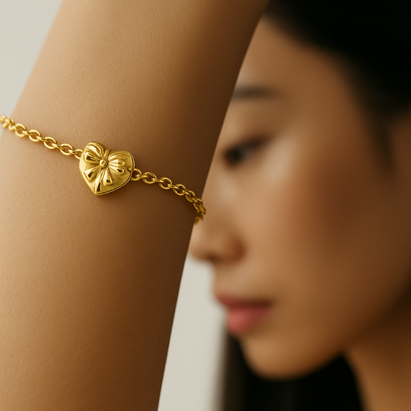 • The Golden Ribbon Heart Charm captures the essence of love and sophistication with its graceful heart design adorned by a delicate bow. Its smooth golden finish radiates warmth and luxury, symbolizing affection wrapped in beauty. Perfect for those who cherish meaningful details, this charm adds a touch of romantic refinement to every look.