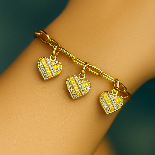 • The Golden Symphony Triple Heart Bracelet exudes refined charm and contemporary sophistication. Each faceted heart shimmers with golden and white-gold tones, catching light beautifully with every movement. The bold link chain adds a modern edge, perfectly balancing strength and romance. A luxurious statement piece that embodies love, confidence, and timeless allure.