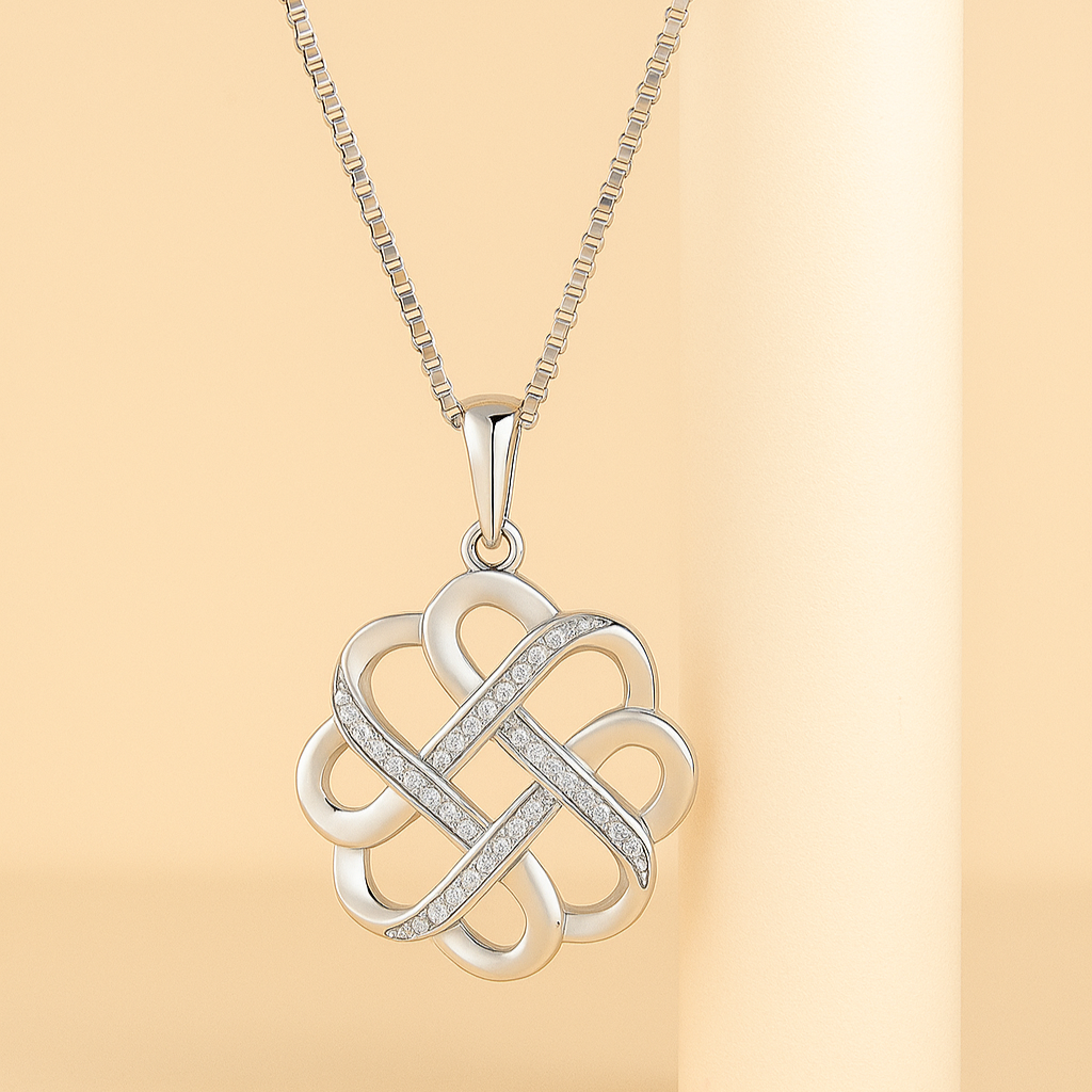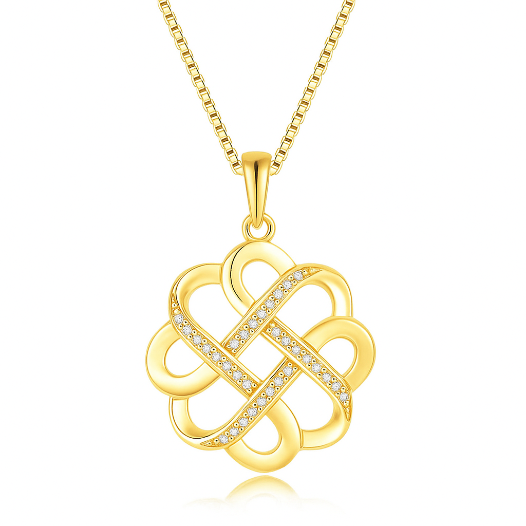 Interwoven golden strands form an eternal knot, accented by delicate diamonds that shimmer with quiet brilliance. A symbol of unity and everlasting devotion, this pendant is both elegant and deeply meaningful.