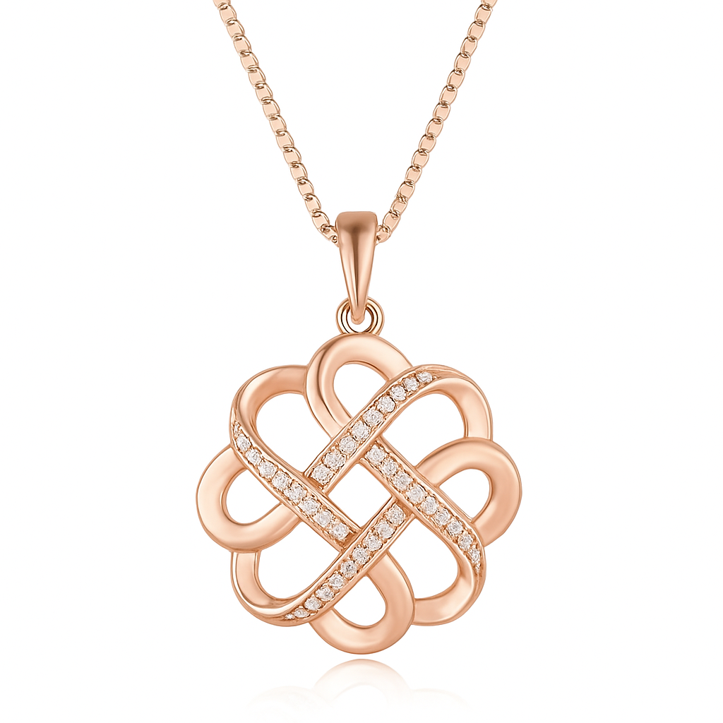 18k yellow, rose, or white gold with VS1 diamonds Interwoven golden strands form an eternal knot, accented by delicate diamonds that shimmer with quiet brilliance. A symbol of unity and everlasting devotion, this pendant is both elegant and deeply meaningful.