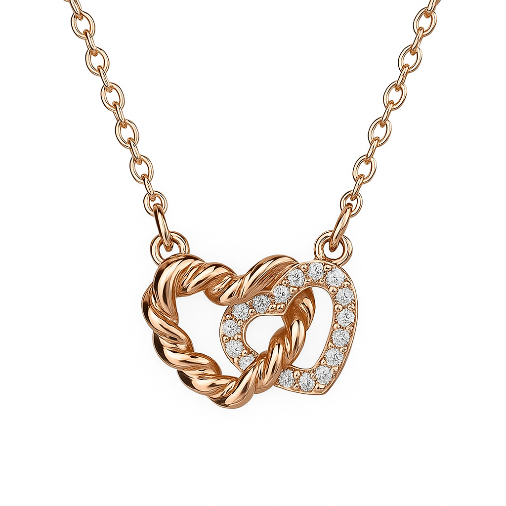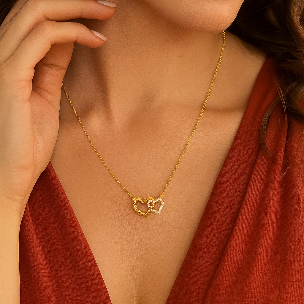 Two hearts, delicately intertwined — one adorned with luminous VS1 diamonds, the other sculpted in a textured gold embrace. Together they tell a story of unbreakable connection, where individuality and togetherness exist in perfect harmony. Each detail is a tribute to love’s duality: tender yet powerful, intimate yet eternal. This necklace captures the magic of promises kept and futures shared, making it a piece to be treasured for generations.    “Hearts of Eternity”