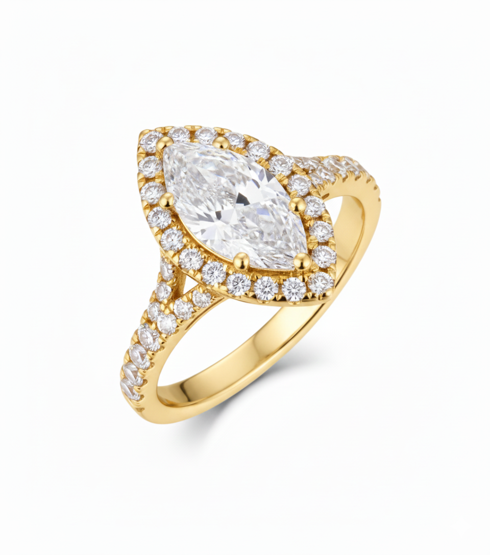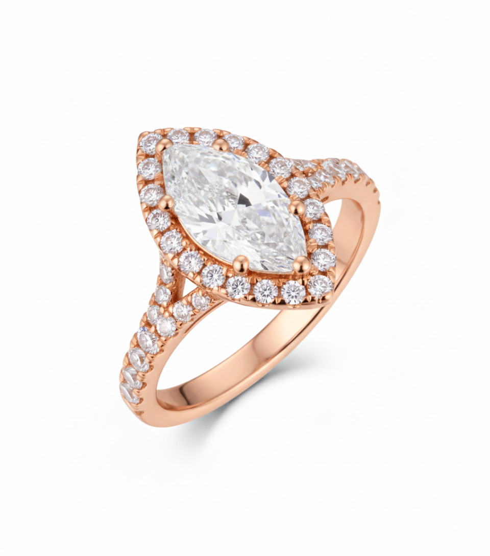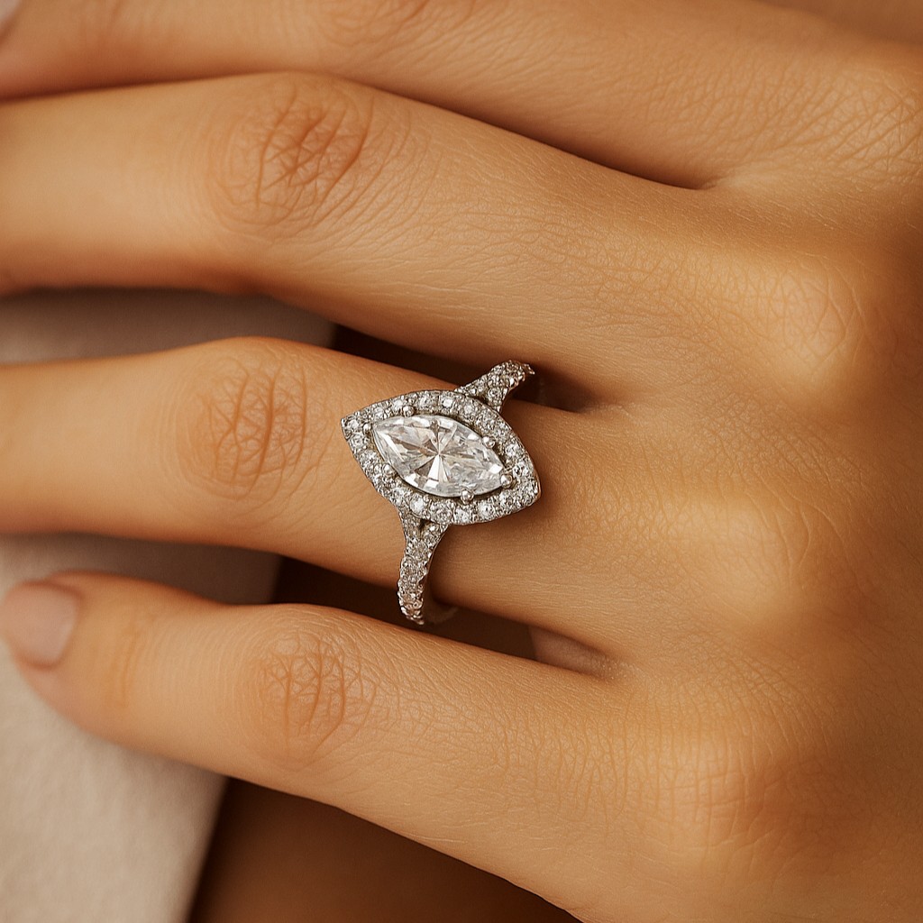 • A marquise diamond haloed in brilliance crowns the hand with dramatic allure. Regal in form and sparkling in presence, it speaks of daring elegance — for a love as rare and striking as the gem itself.