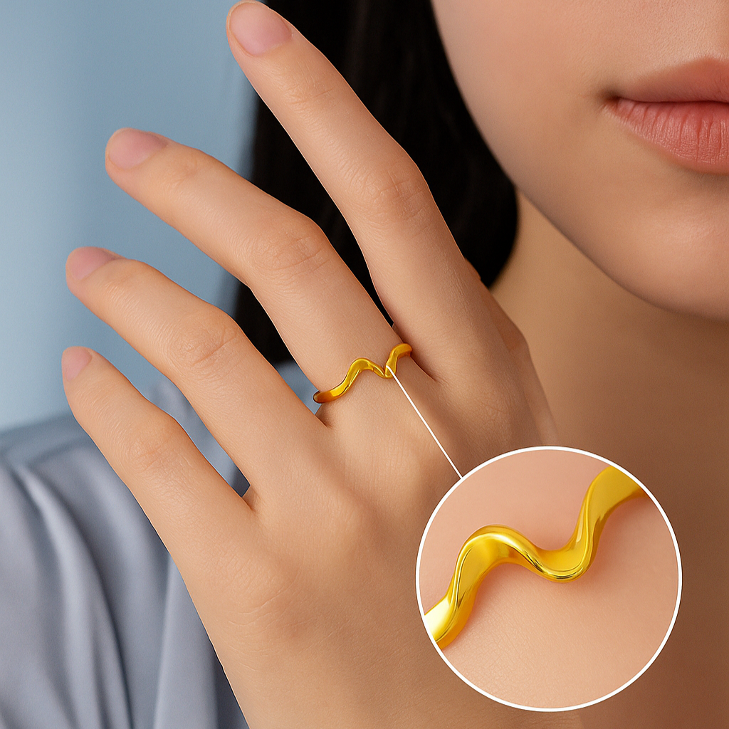 • Discover the allure of artistic design with this unique gold ring, meticulously shaped into a striking, fluid wave. The smooth, uninterrupted line is a masterpiece of modern minimalism, ensuring a truly eye-catching and luxurious statement. This piece is ideal for the contemporary individual who seeks jewelry that is both artistic and effortlessly stylish.