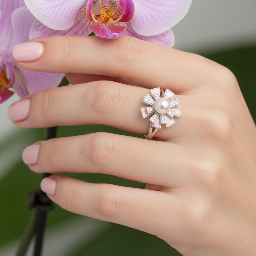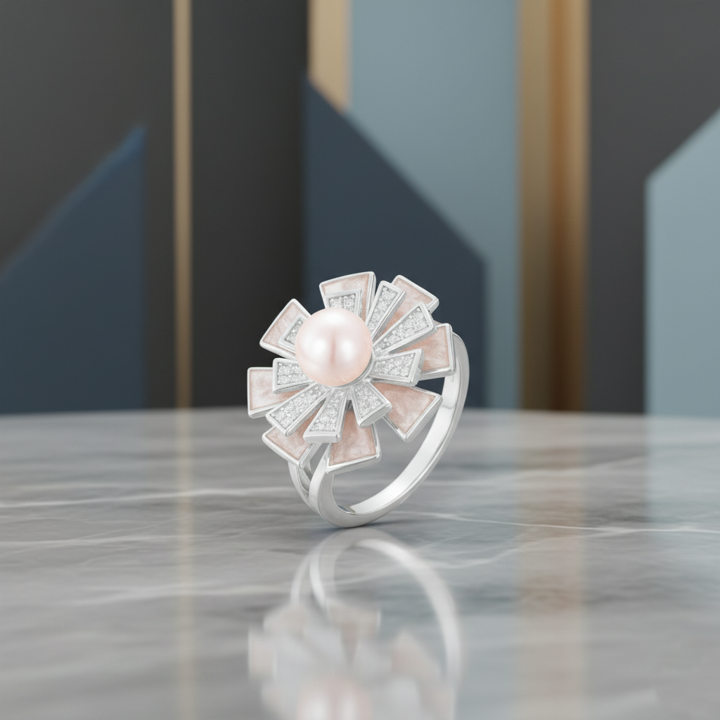 This sculptural masterpiece features a luminous pink pearl set at the heart of a geometric blossom. Radiating from the center are alternating panels of high-polish metal and diamond pavé, forming bold petals that shimmer with every movement. The design balances architectural lines with organic fluidity, creating a ring that feels both avant-garde and timeless. A statement of modern luxury, it evokes the delicate strength of a flower blooming at first light.