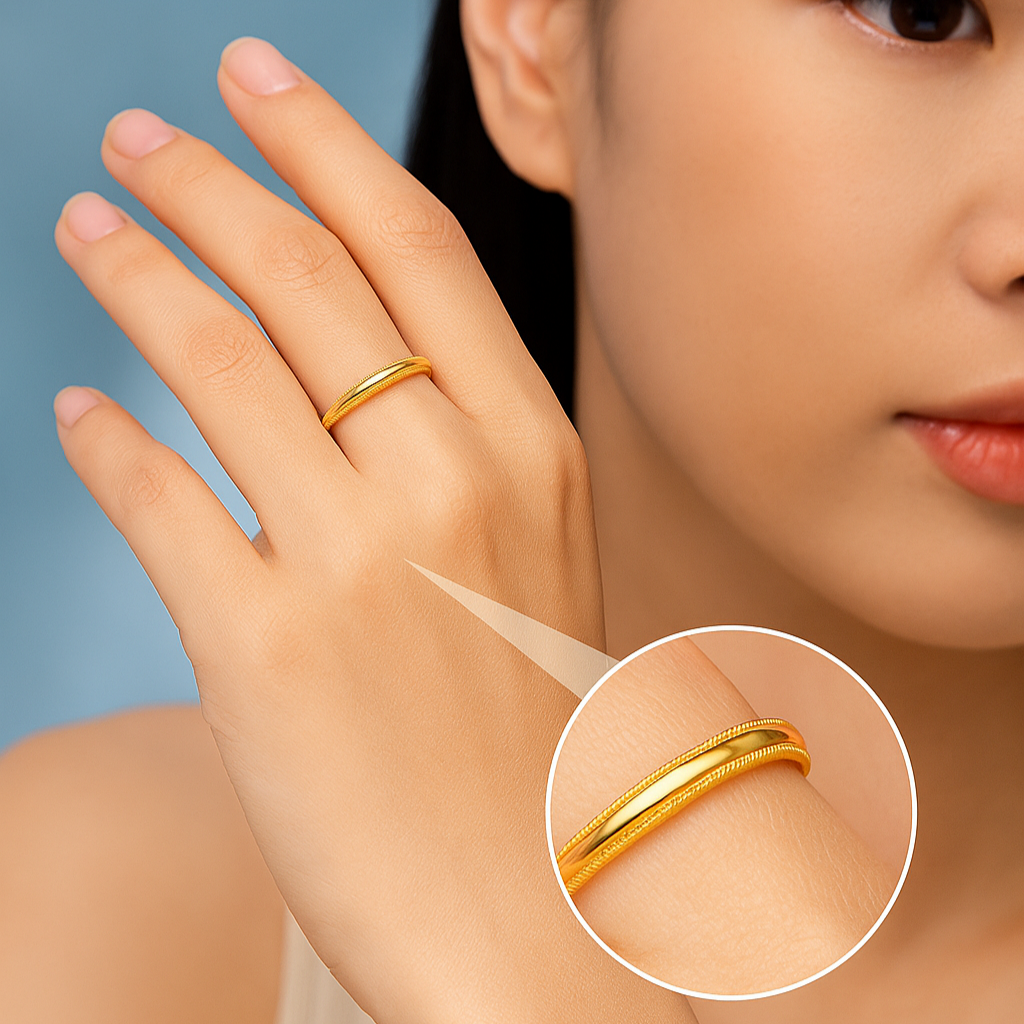 • This 2.8-gram gold ring represents the pinnacle of craftsmanship, featuring a perfect 2.5mm width and exquisite textured edges for unmatched visual interest. It's a modern classic that carries the weight of luxury and tradition, symbolizing completeness and enduring worth. With sizes ranging from 9-10 to 12-20, this exclusive set offers a precious and unforgettable golden treasure.