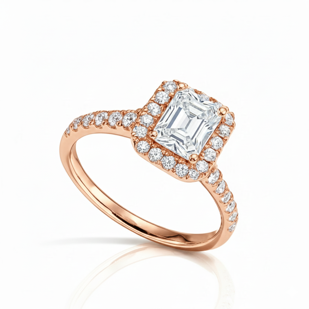 A modern fairy tale captured in a jewel, this ring features a princess-cut diamond whose sharp, clean lines command attention. Surrounding it, a glittering halo of pavé diamonds adds softness to the geometry, balancing strength with brilliance.