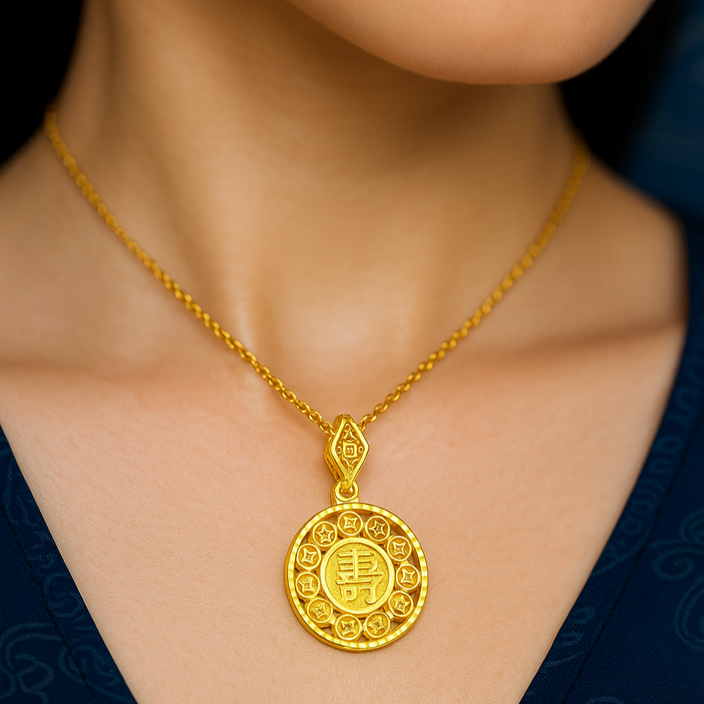 A 20mm 916 gold pendant symbolizing prosperity, harmony, and timeless blessings.