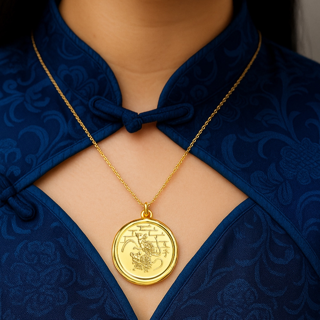 • Finely detailed in 916 gold, this elegant pendant depicts a pair of rats — an auspicious emblem of cleverness, abundance, and opportunity. The intricate engraving brings life to their dynamic form, framed within a radiant circular design. A timeless charm of good fortune, this 14mm and 16mm pendant captures the spirit of prosperity and resilience, perfect for those who value wit and success.