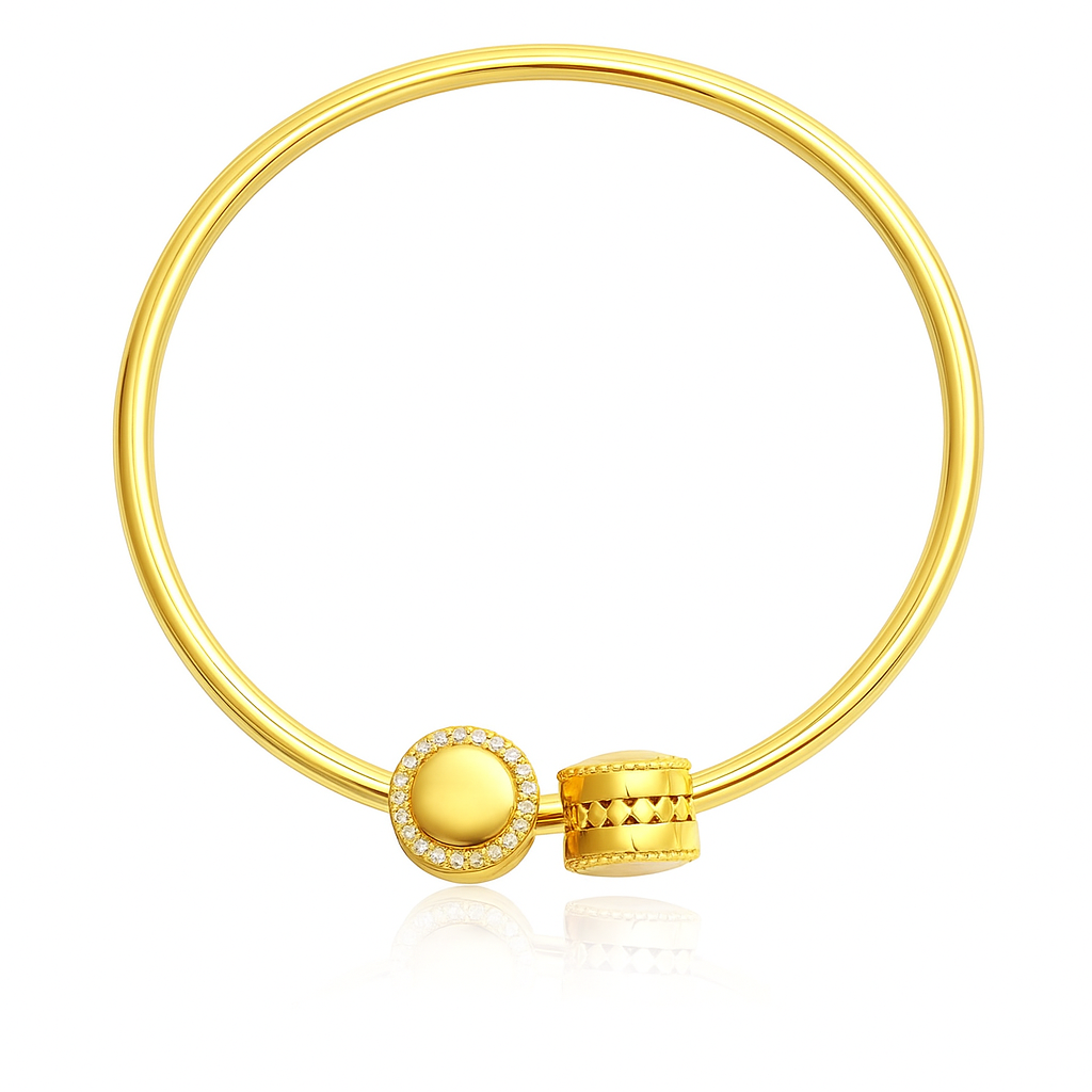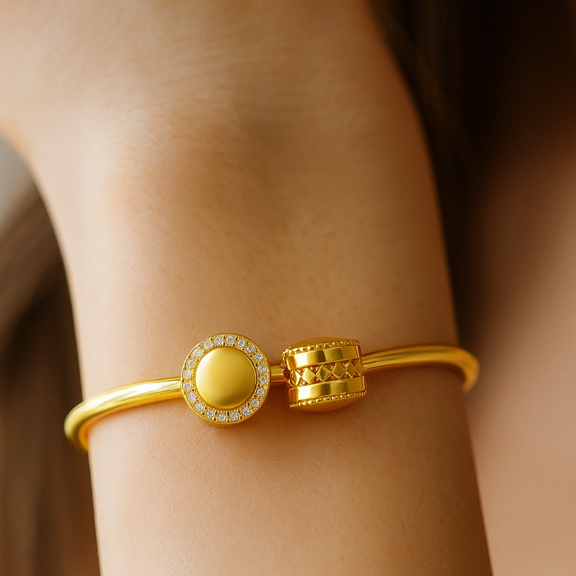 • Crafted to perfection, the Radiant Aura Gold Charm embodies timeless sophistication with a contemporary twist. The brilliant gold finish is encircled by dazzling stones that radiate confidence and grace. Perfect for adding a touch of luxury to your bracelet or necklace, this charm speaks the language of modern opulence—refined, radiant, and unforgettable.