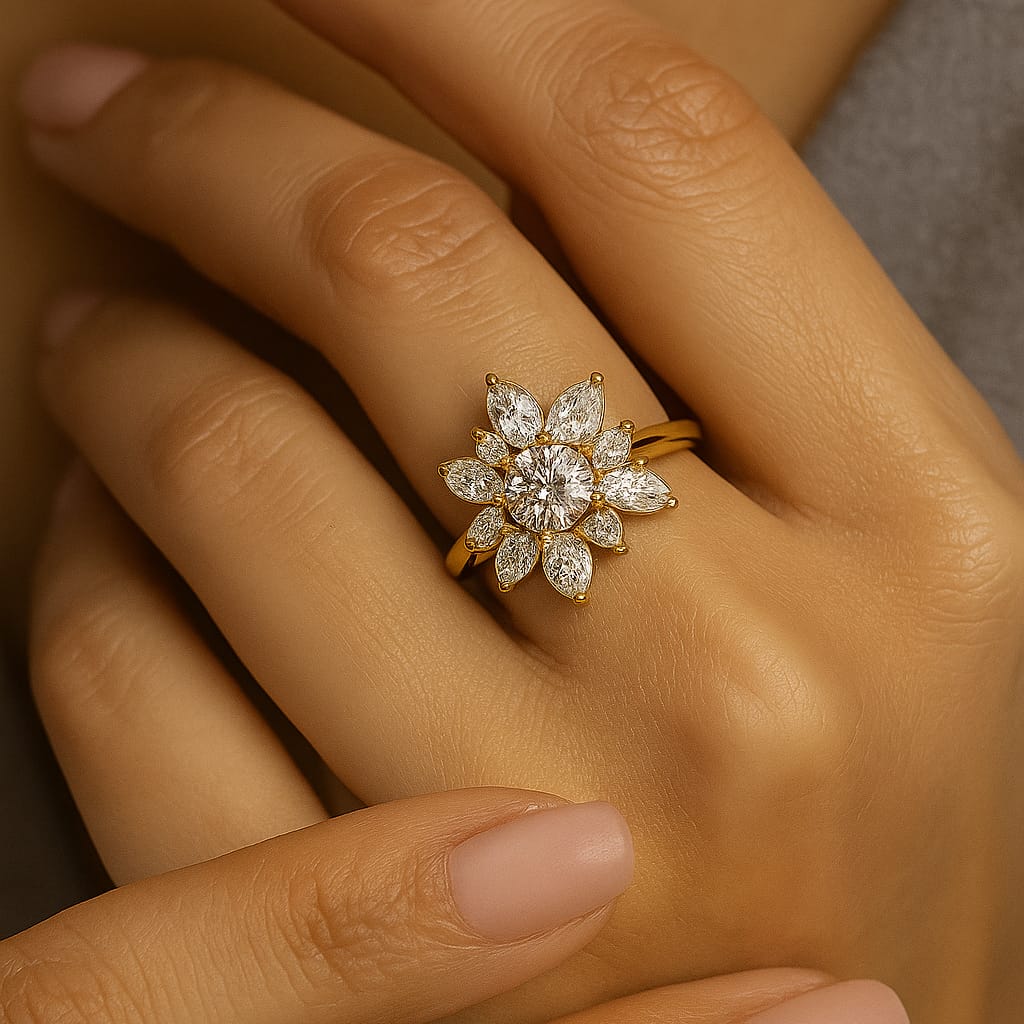 A golden blossom unfolds in this statement ring, where marquise and round-cut stones form a dazzling floral motif around a luminous central gem. Each petal radiates light, symbolizing vitality, grace, and the flourishing beauty of nature. Perfect for those who wish to wear the brilliance of a garden on their hand.