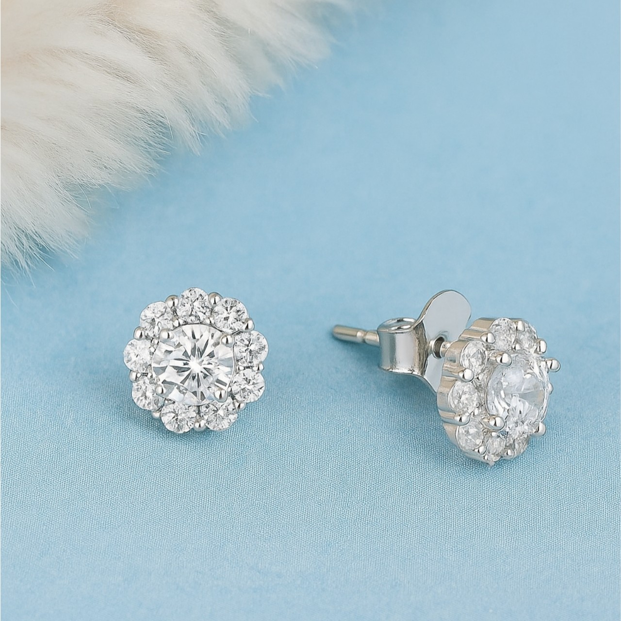 This earring captures the delicate beauty of a flower in full bloom. The pair feature a luminous central diamond surrounded by a halo of petals, each set with brilliant VS1 diamonds that glisten like morning dew. Worn together with the pendant and ring, they radiate harmony and elegance, offering the perfect expression of femininity and grace.