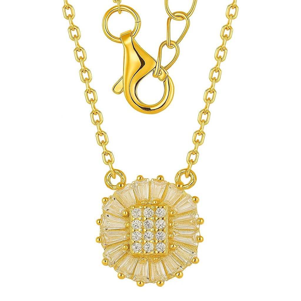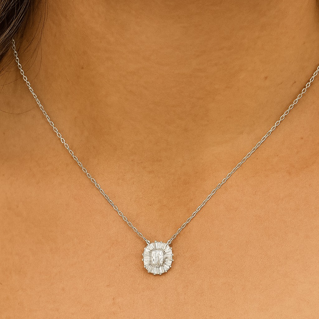 A striking expression of brilliance, this necklace features a sunburst-inspired pendant of baguette and round VS1 diamonds arranged in a dazzling halo. Crafted in 18K gold, available in white, yellow, or rose, it is designed to catch the light with every movement for an unforgettable sparkle.