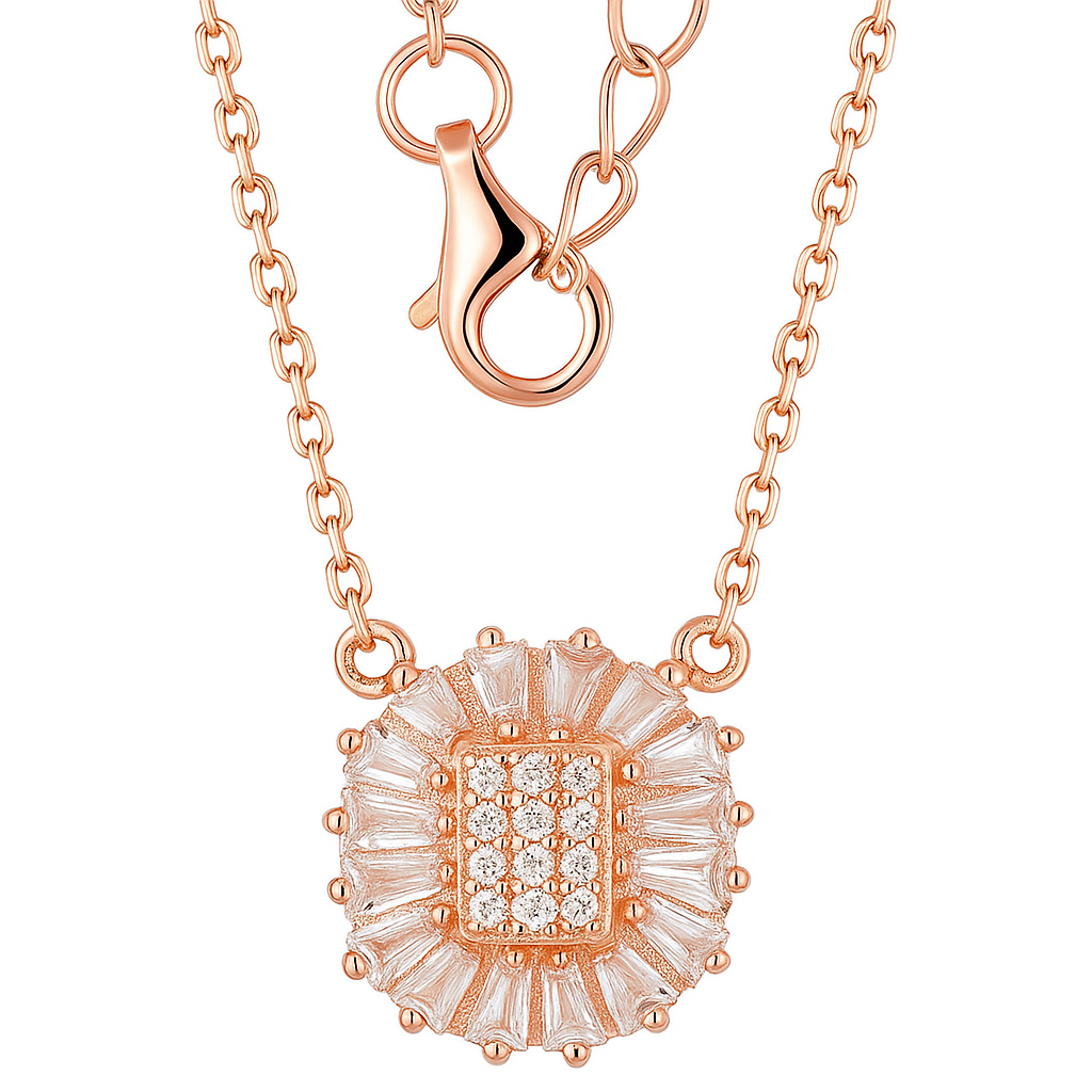 • A striking expression of brilliance, this necklace features a sunburst-inspired pendant of baguette and round VS1 diamonds arranged in a dazzling halo. Crafted in 18K gold, available in white, yellow, or rose, it is designed to catch the light with every movement for an unforgettable sparkle.