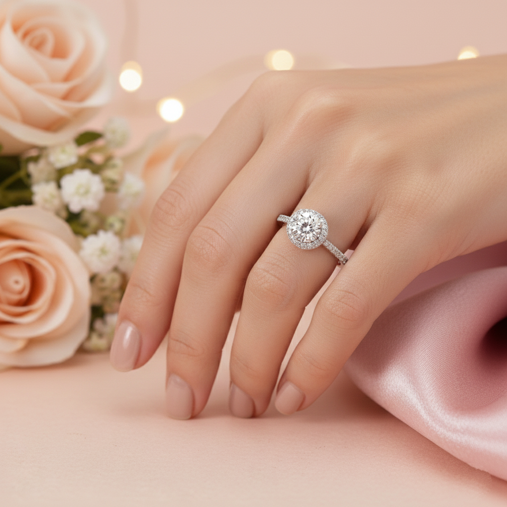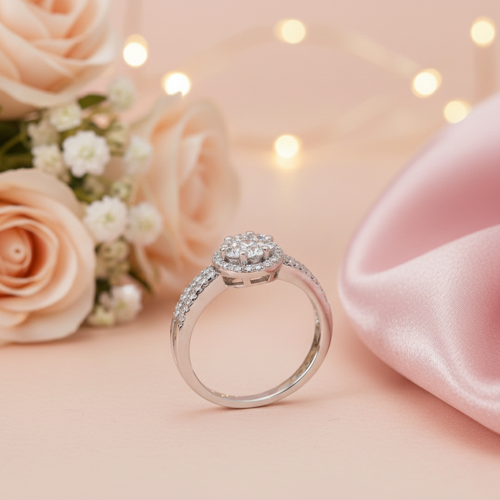 Clusters of brilliant stones form a sparkling oval halo around the central diamond, blending fire and balance. Pavé shoulders add fluidity and sparkle to the composition. This ring evokes togetherness — a harmony of individuality and unity, perfect for a love that celebrates both.