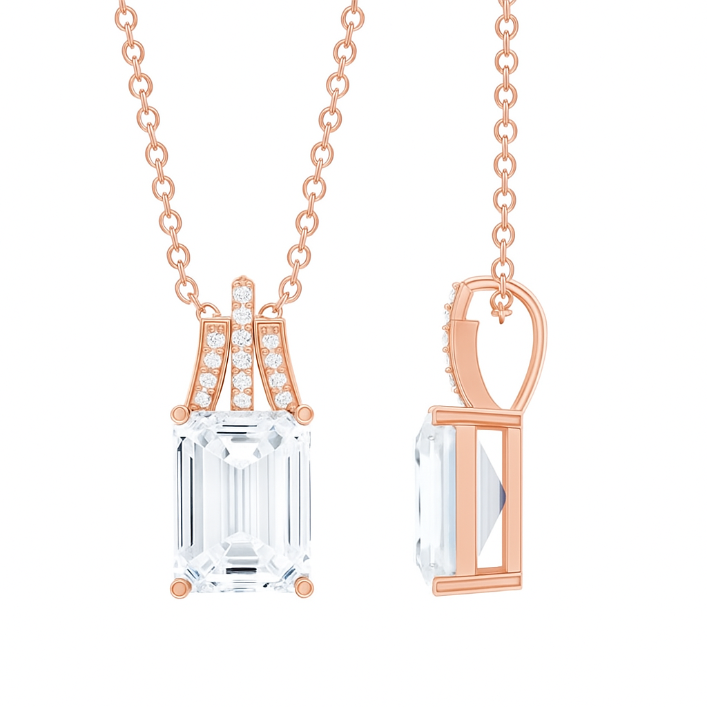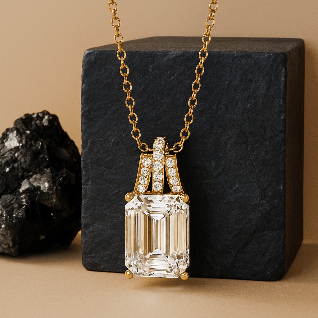 An emerald-cut diamond, held within an architectural crown of VS1 diamonds, radiates stately elegance. The structured design is both timeless and contemporary, evoking grandeur and poise. A pendant that commands presence and admiration.