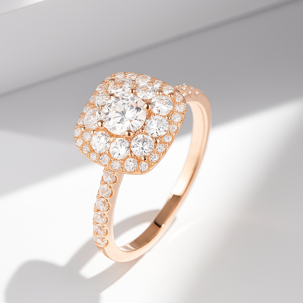 A constellation of diamonds forms a radiant cluster, embraced by a diamond-paved band in warm 18k rose gold. Like a night sky lit with countless stars, this ring captures the romance of dreams illuminated by love.