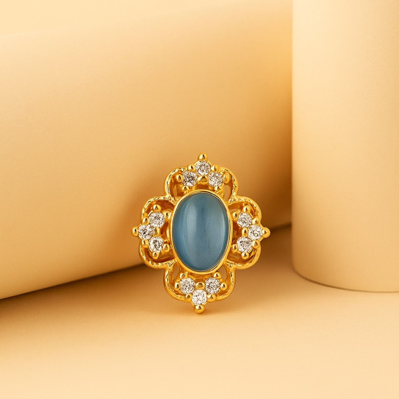 An oval-cut blue gemstone lies at the heart of this ornate pendant, framed by intricate golden details and brilliant diamonds. Regal and striking, it embodies wisdom, power, and a horizon filled with promise.