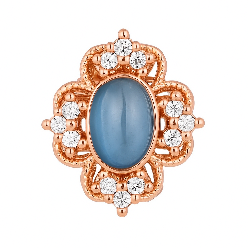18k yellow, rose, or white gold with VS1 diamonds An oval-cut blue gemstone lies at the heart of this ornate pendant, framed by intricate golden details and brilliant diamonds. Regal and striking, it embodies wisdom, power, and a horizon filled with promise.