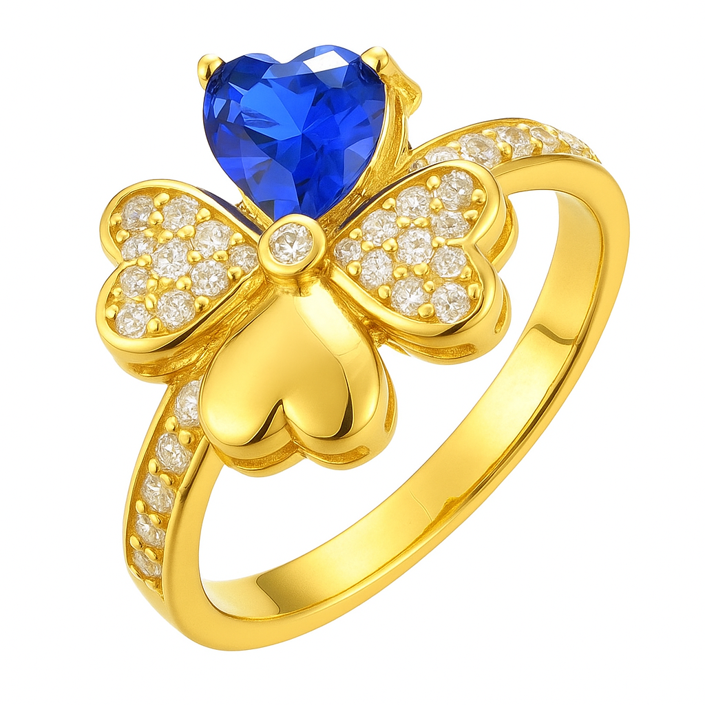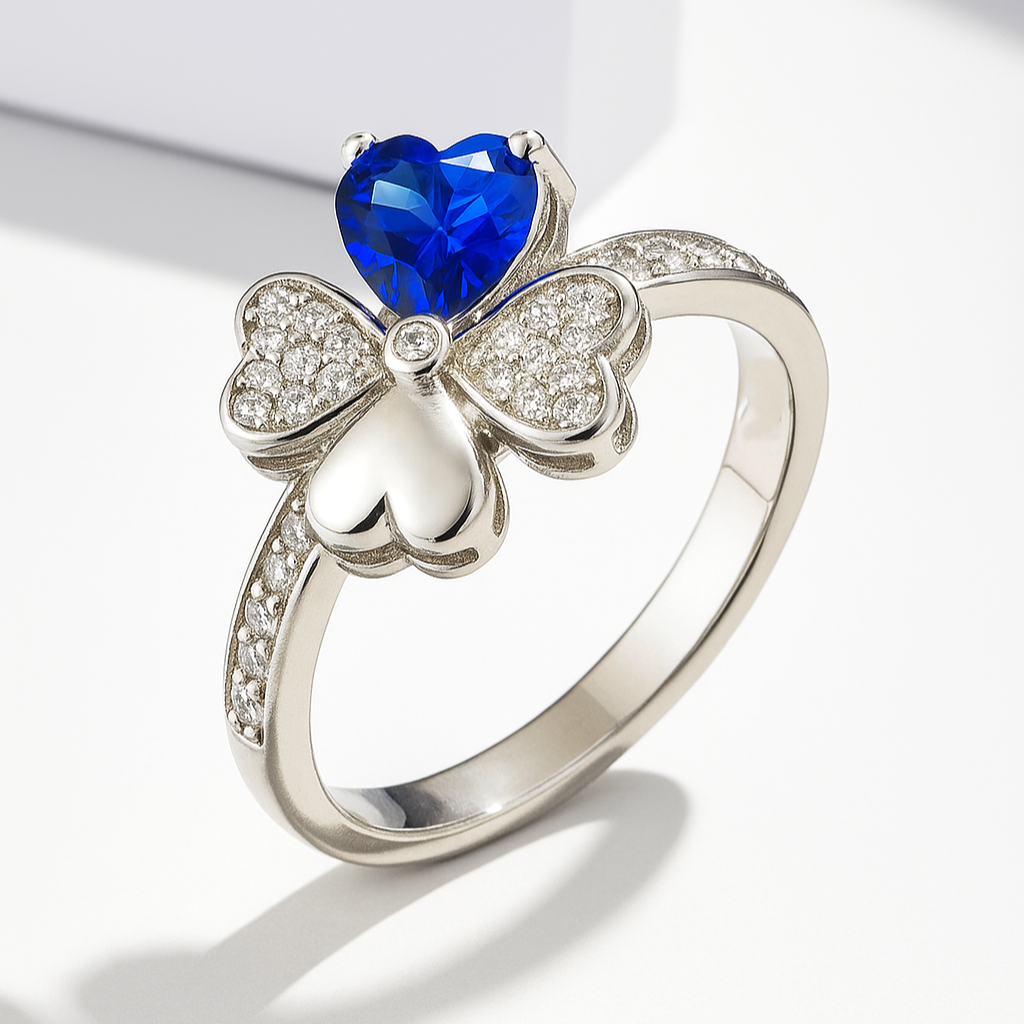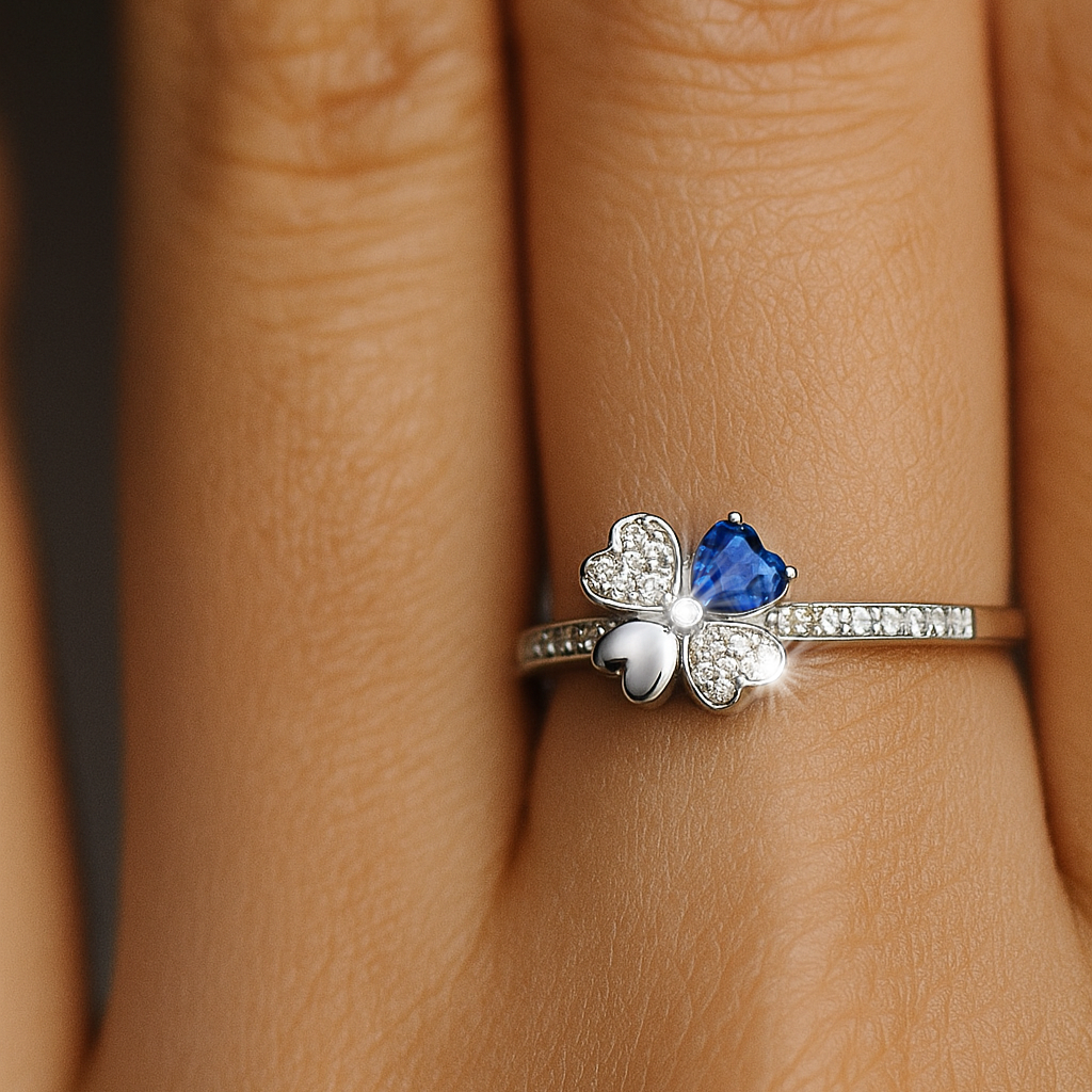 Romantic and whimsical, this 18K gold ring features a clover motif adorned with VS1 diamonds, crowned by a heart-shaped sapphire. A design that balances playful charm with deep emotional meaning.