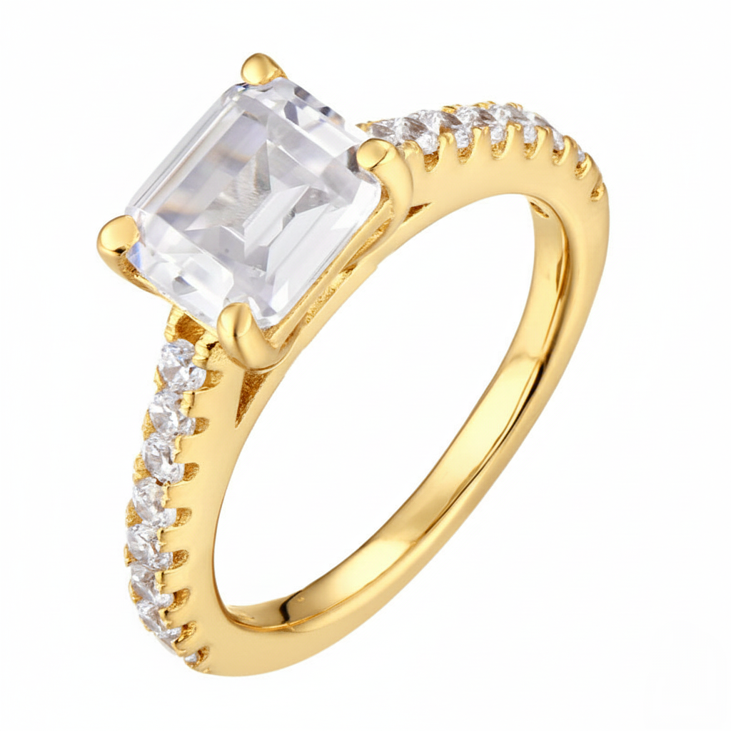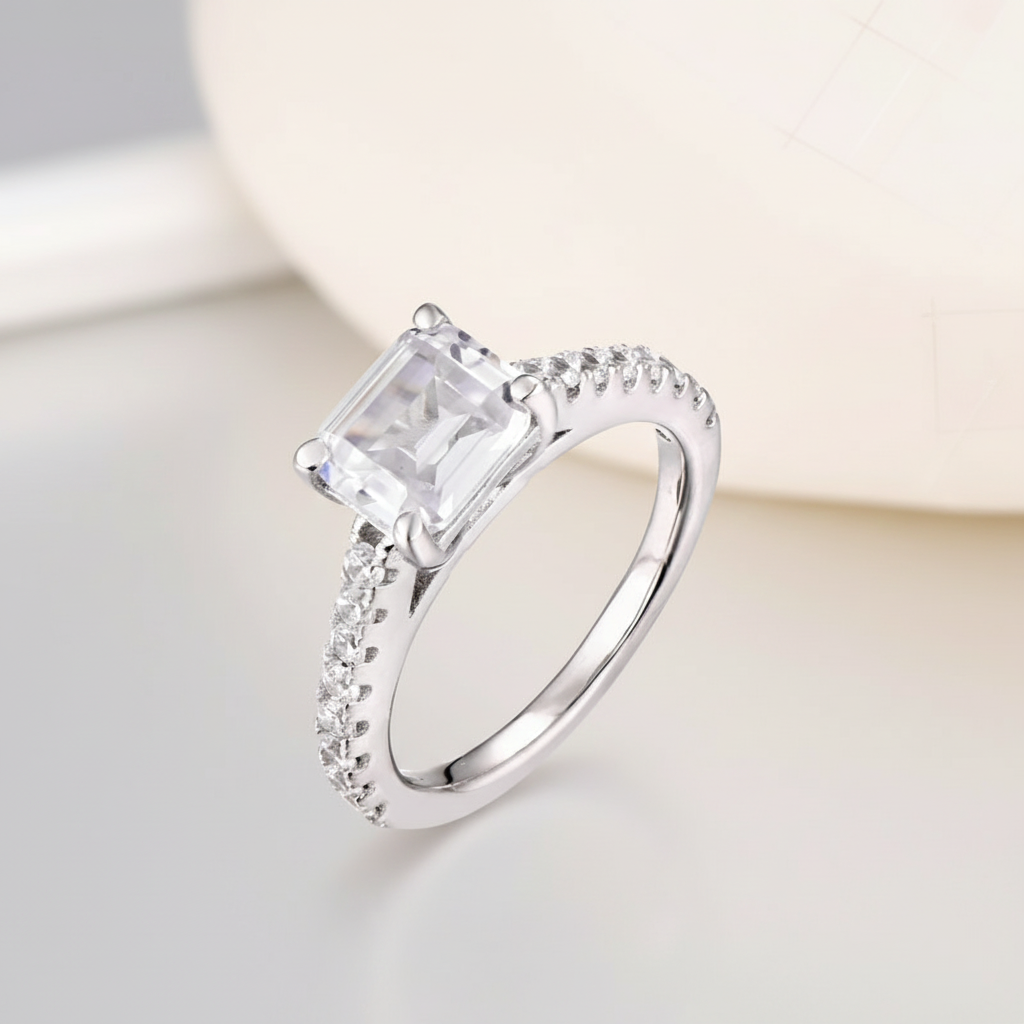 A modern twist on a classic, this ring presents an emerald-cut diamond mounted on a pavé band. The open clarity of the step-cut emphasizes purity and precision, while the fine round diamonds along the shank lend subtle sparkle. Its clean lines make it versatile and elegant, suitable for both contemporary and traditional tastes.